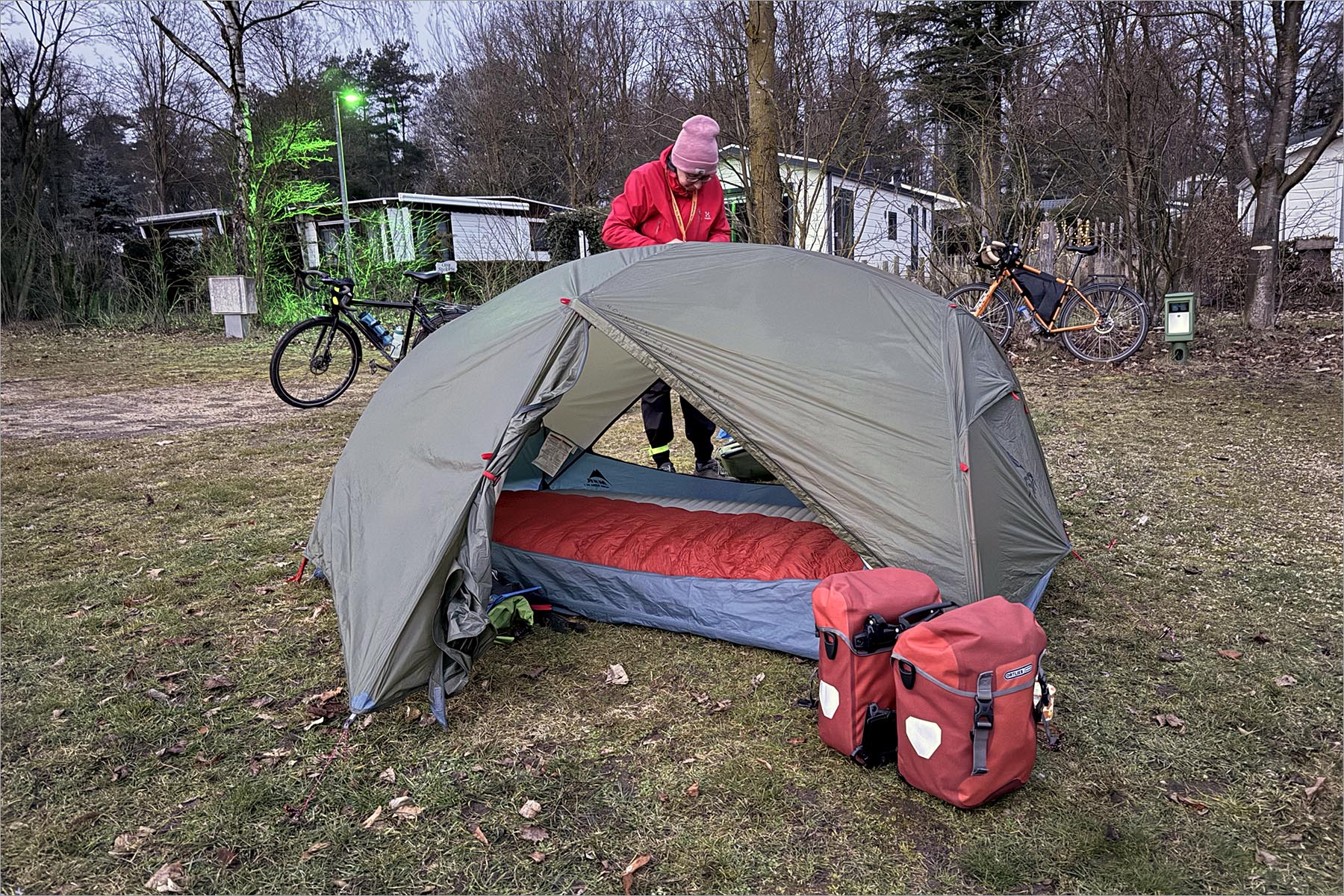 Hubba Hubba HD 2 tijdens het fietsen van het Pieterfietspad, 18 februari 2026. De volgende morgen werden we wakker met sneeuw -:).