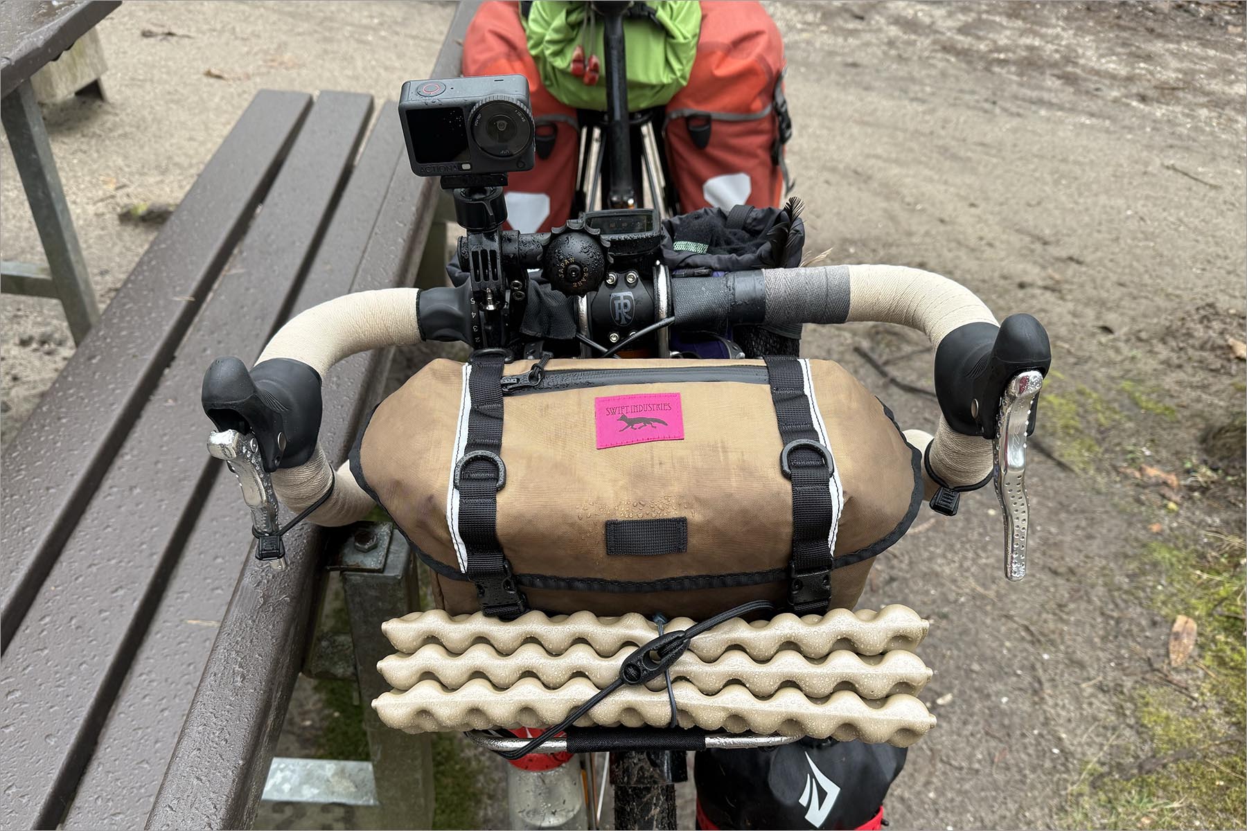 - Stuur: Revelate Designs Egress Pocket (video) | Waterdicht, precies groot genoeg voor alle waardevols dat ik onderweg nodig heb (pasjes, cash, accu’s videocamera + lader, videocamera bij stortbui, laadkabels, paspoort), weegt weinig en (yes!) klappert niet op boswegen. Zit met twee 9″ Voile Nano straps (smaller en kleiner dan de standaard straps, geschikter voor de beperkte ruimte op een stuur) muurvast aan het stuur.
