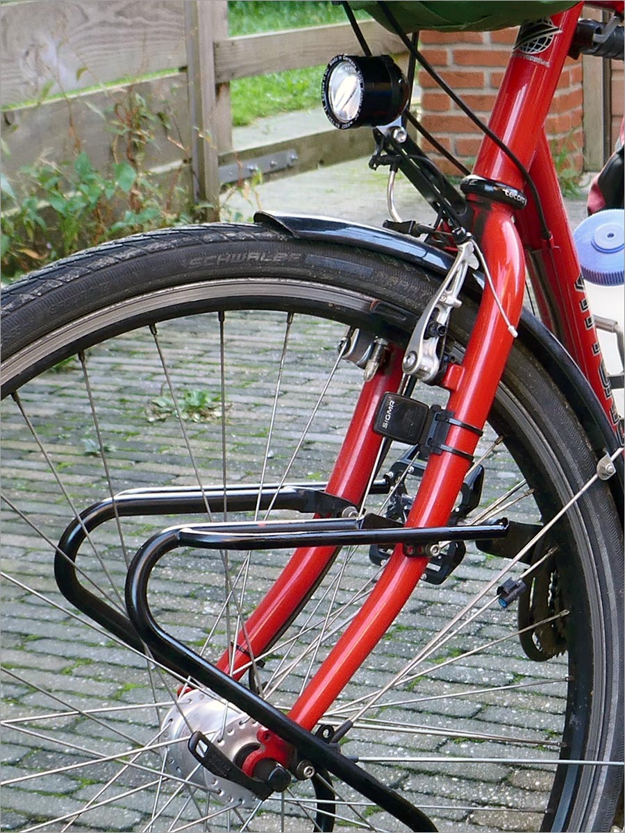M’n gedachten stromen. Waarom deert de regen me niet? Omdat ik de juiste spullen bij me heb, die het nog doen ook. Een Gore-Tex jas met een goede capuchon, waar niets doorheen gaat en die niet benauwd wordt omdat hij vocht doorlaat. Voor- en achterlicht op een naafdynamo, waardoor ik onbeperkt stroom heb en ik in een regenbui, op smalle landwegen en met een grijze lucht, m’n licht uren aan kan laten zonder bang te hoeven zijn dat de accu te vroeg leeg is. En nog veel meer. Goede spullen meenemen betekent dat m’n aandacht niet wordt opgegeten door materiaalruis, maar beschikbaar is voor de belangrijke dingen: de omgeving, de weg, een klim, het verkeer.