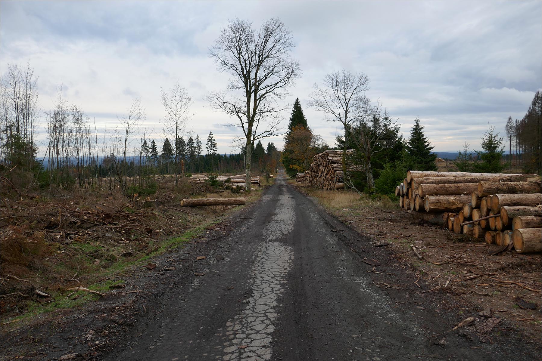 Voorbij Bornhausen gaat de weg weer licht stijgen en gaat even een herfstbos in. Bij Neuekrug, een groep vakwerkhuizen na Hahausen, stuit de route op de noordrand van de Harz en blijft die vele kilometers naar het oosten volgen. Het verkeer houdt op, ik ben alleen met een enkele vakantiefietser. De rand van het bos, het grote groene ei-op-z’n-kant dat de Harz op de kaart vormt, is abrupt. Rechts liggen gezaagde stammen vele meters hoog opgestapeld, daarachter beginnen de bomen. Links van me blijft het landschap open, met een spoorlijn die net als ik de bosrand blijft volgen. De weg is een goed bewaard gebleven specimen van het type eiland-asfalt, dat alle ledematen, organen en bagage laat rammelen en stuiteren. Na verloop van tijd sluit dat asfalt zich weer weer over de kasseien en kan ik om me heen kijken in plaats van strak naar de ribbels en randen op de weg. Niet voor lang. De mix van zwarte kinderkopjes en vlekken asfalt voelt rauw en als avontuur. Het voelt ook aan als een enorme shitweg, al kan ik me er na alle R1-tjes niet meer druk om maken.