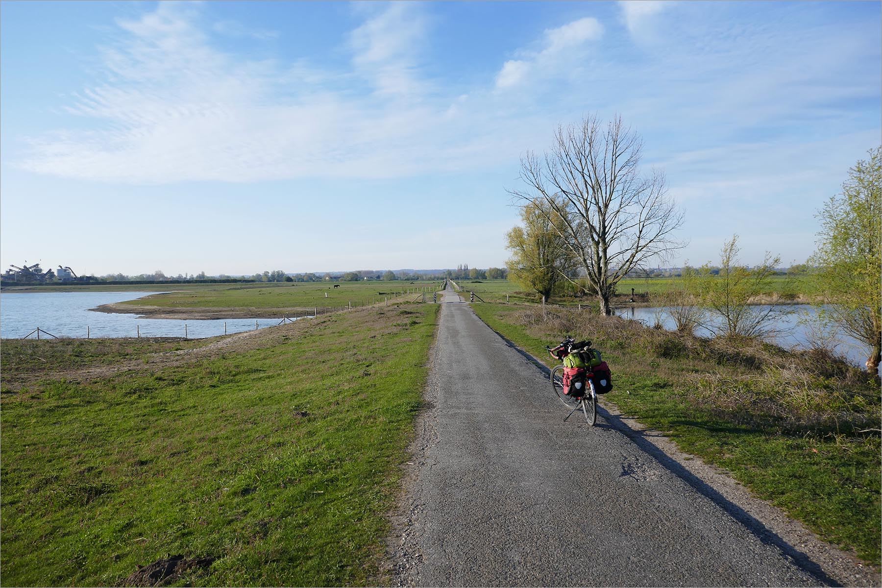 Vanaf de Waaldijk zie ik Nijmegen liggen, met verderop over de rivier de boog van de Oversteek. Plekken die ik ken, van eerdere tochten, m’n gedachten gaan rollen. Schuchter, maar de goede kant op. Dit is leuk fietsen. Ik zit anders op m’n fiets dan gisteren. Uitgerust, met meer aandacht voor alles om me heen. De wind is nog steeds koud, vandaag gaat het 15 graden worden, een dag die goed begonnen is.