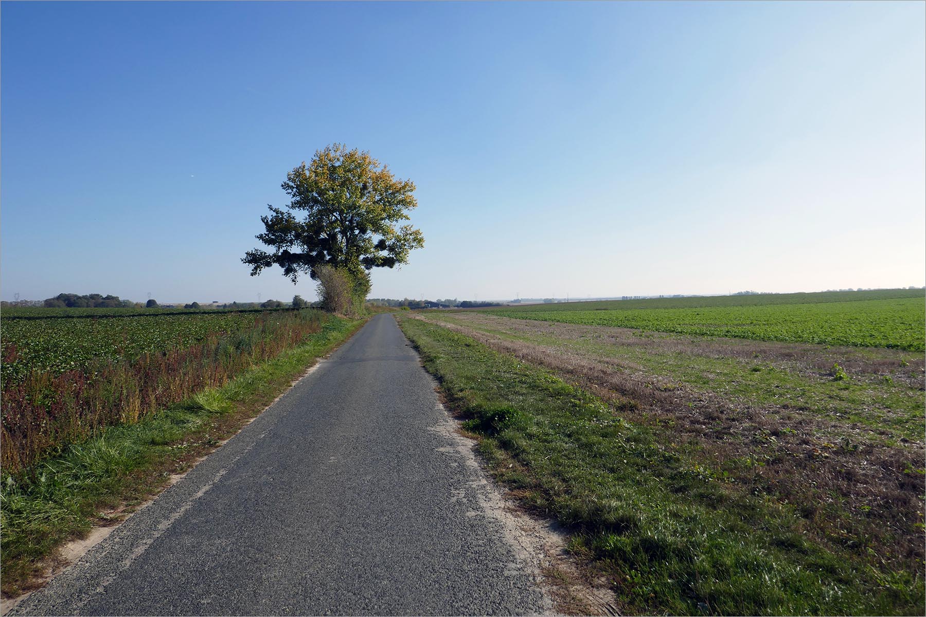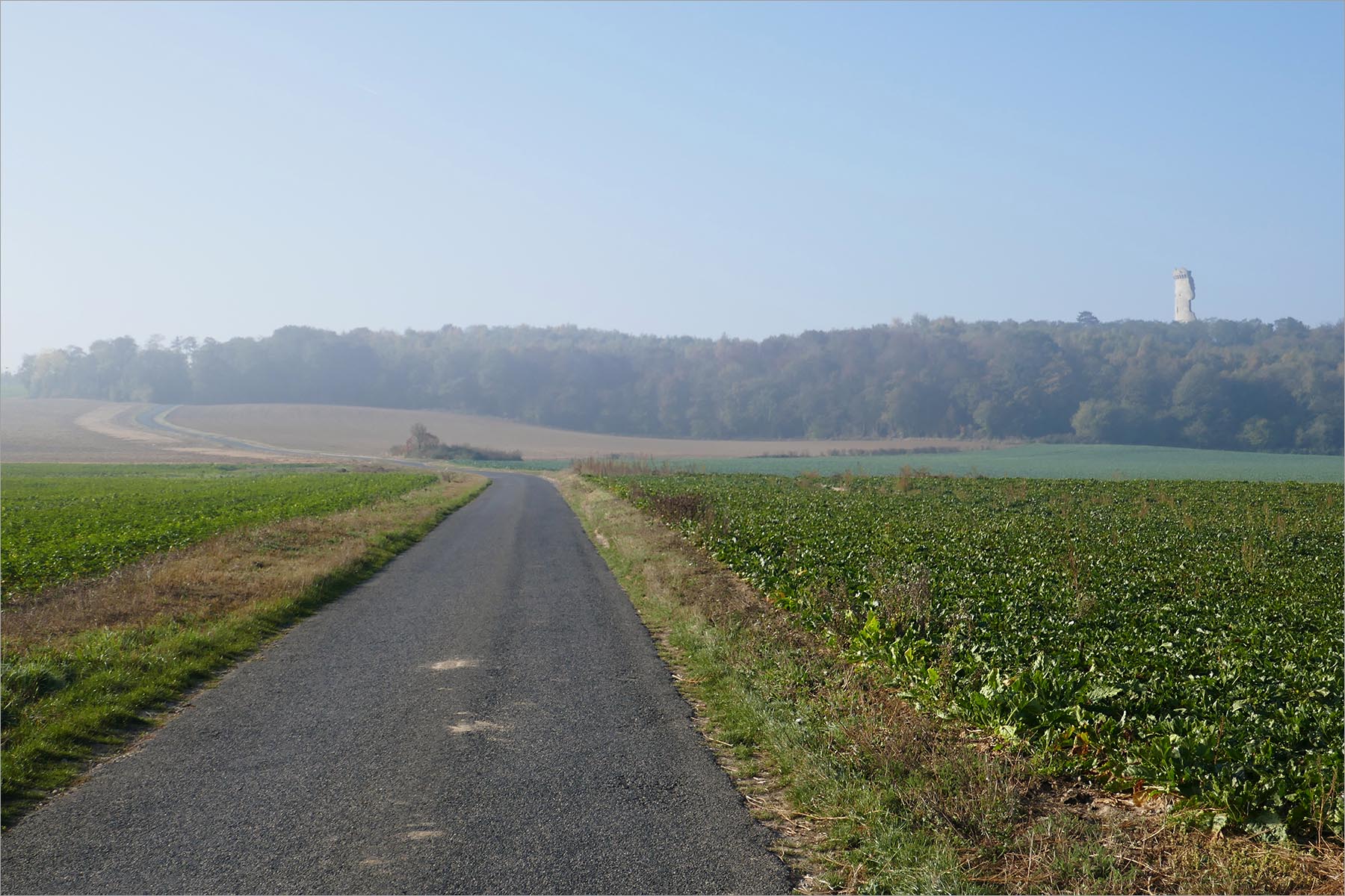 De eetpauze werkt, de energie is terug. Fietsend door de akkers lost de mist op, wat achterblijft zijn een strakblauwe hemel en een zon die als een oplader de warmte door m’n lijf verspreidt. Het land en ik koesteren ons in de najaarszon, het is het mooiste weer van de wereld. In de verte rechts steekt het overgebleven halfronde deel van de donjon van het kasteel van Montépilloy vreemd en nog steeds indrukwekkend boven de bossen uit. Ooit het 35 meter hoge laatste toevluchtsoord voor de kasteelbewoners, met een verwijderbare trap tussen de toren en de rest van het kasteel, voor als de belegeraars de kasteelpoort waren gepasseerd. Het land golft wat, de handschoenen mogen uit, ik passeer het kasteel en het dorp op een kleine verhoging in het landschap en ga zingend in de zon door naar Fontaine-Chaalis.