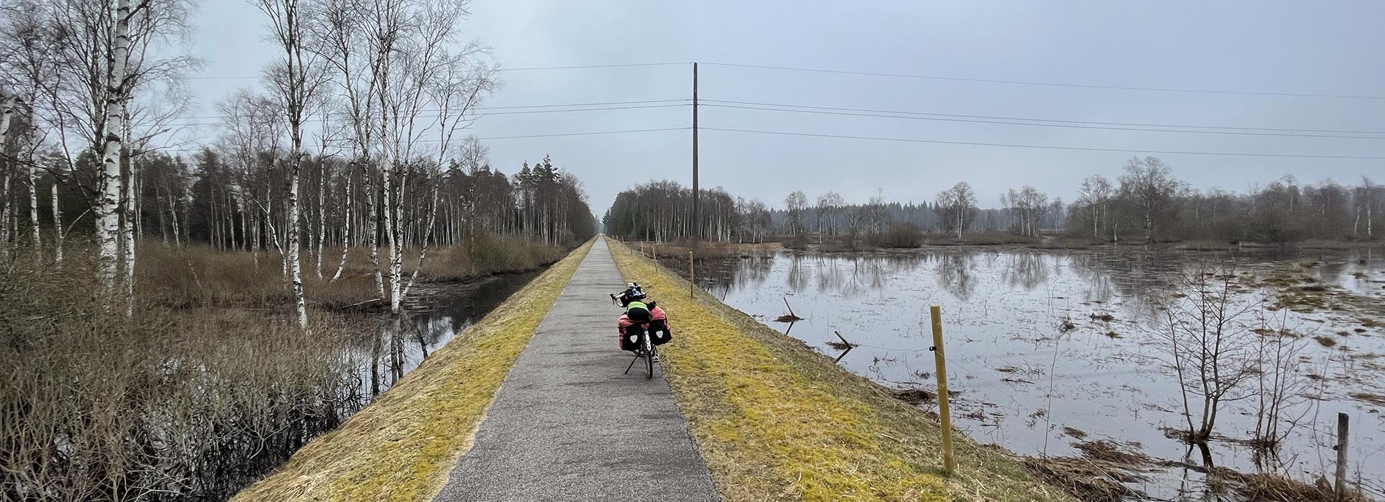 De realiteit overtreft m’n verwachtingen. Het rechte en vlakke asfaltpad gaat tussen bomen, wetlands en kleine heides door. Hier moet een spoorlijn gelopen hebben, kan niet anders. Nu loopt er zo goed als niemand, het fietsen in de stilte is meditatief. Wat is dit leuk.