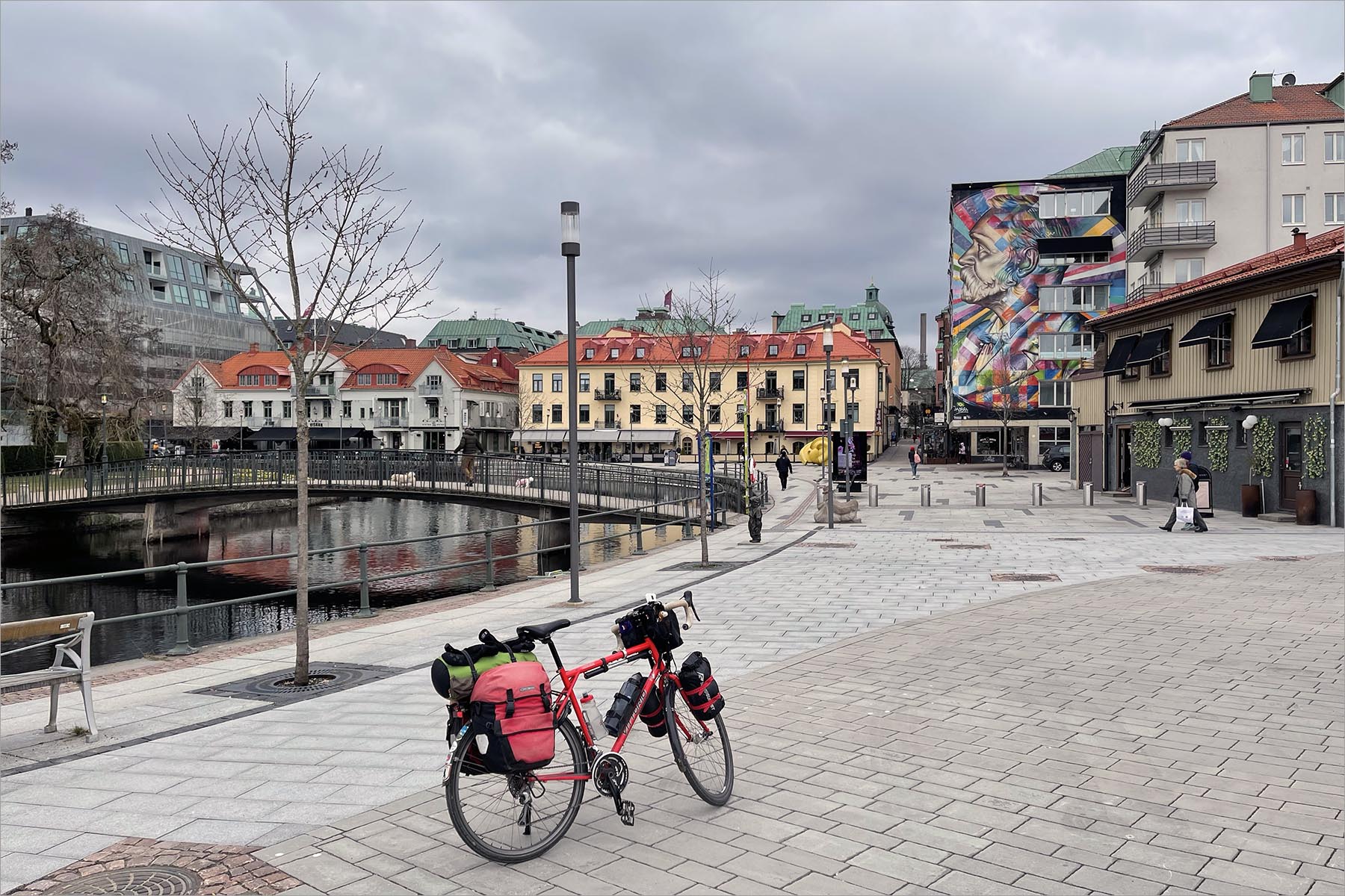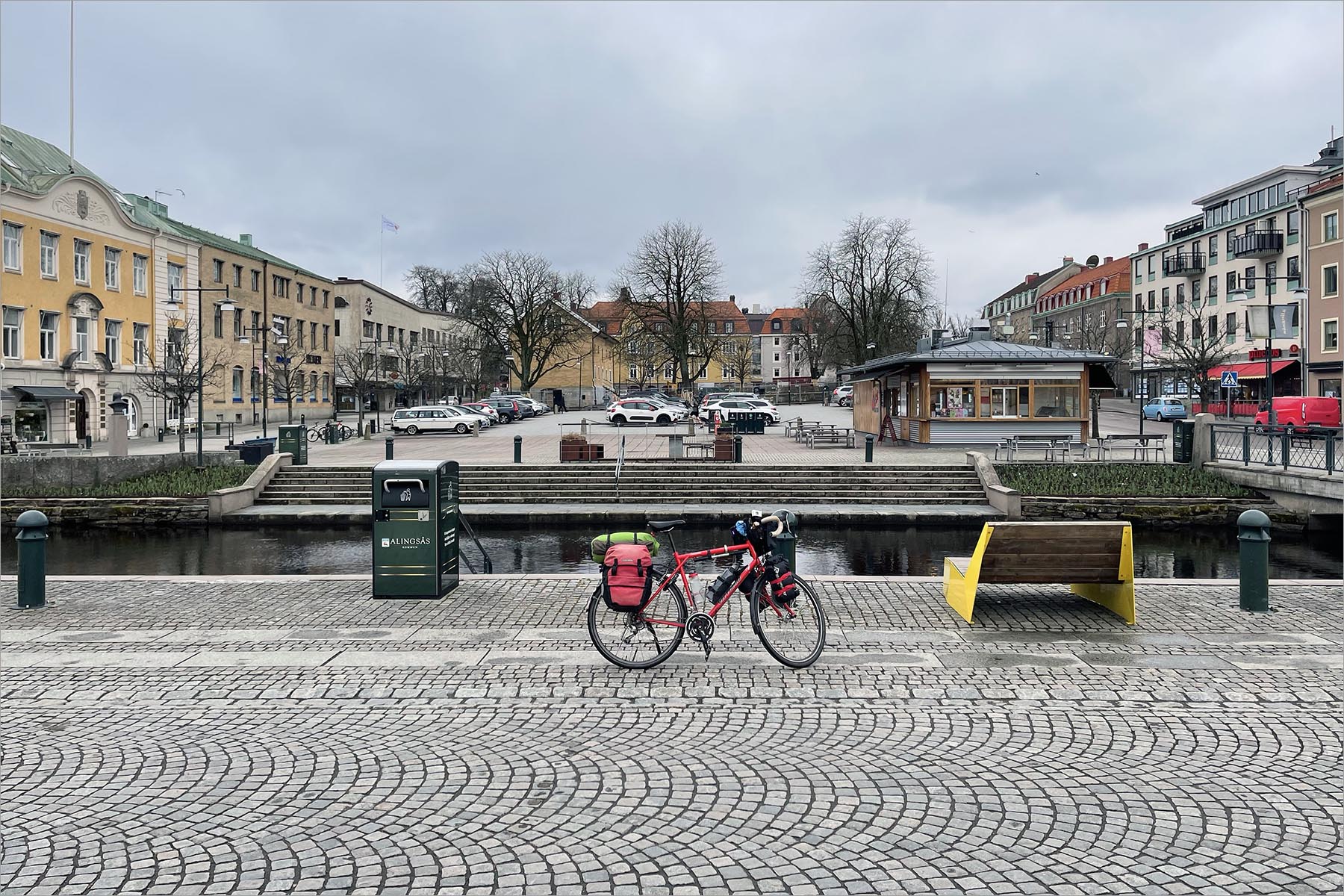 Mijn route verlaat de fietsroute en gaat steil omhoog een buitenwijk van de stad in. Drie kilometer verderop sta ik in het centrum van Borås. Leuk. Hier was ik in de derde week van maart 2018, toen hier de tunnelconferentie werd gehouden waarnaar ik nu op weg ben. Toen lag er sneeuw en was het een stuk kouder. Ik ging er met de trein naartoe, via Hamburg en Kopenhagen, een avontuur op zich. Vandaag geen sightseeing, het enige wat ik hier wil is een fietsenmaker vinden die de speling in m’n achternaaf kan verhelpen. Hier zitten beslist fietsenmakers.