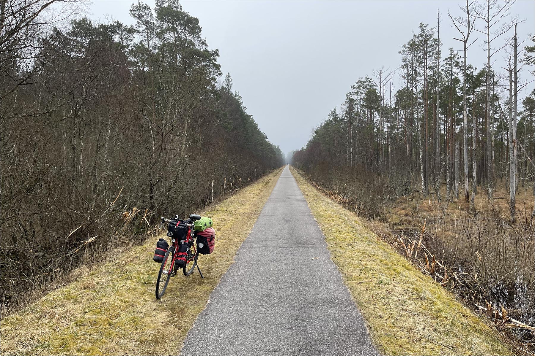 Asfalt wordt zand, dat goed te fietsen is. Ik besluit door te rijden naar het einde van de track, waar ik thuis op de kaart een schietbaan zag met een gebouwtje, zoiets als bij Mörarp. Daar ga ik slapen, dan heb ik alsnog de hele track van vandaag gefietst en heb ik morgen een kalme dag van 85 kilometer.