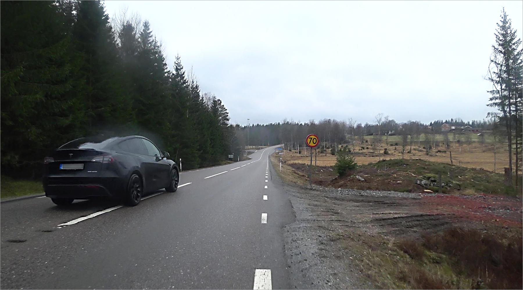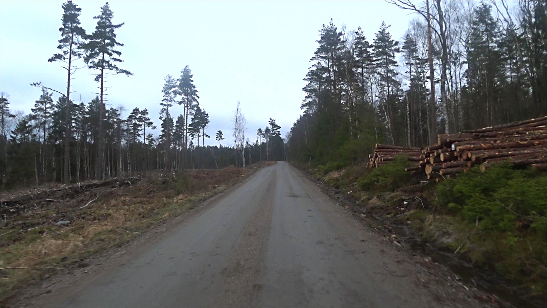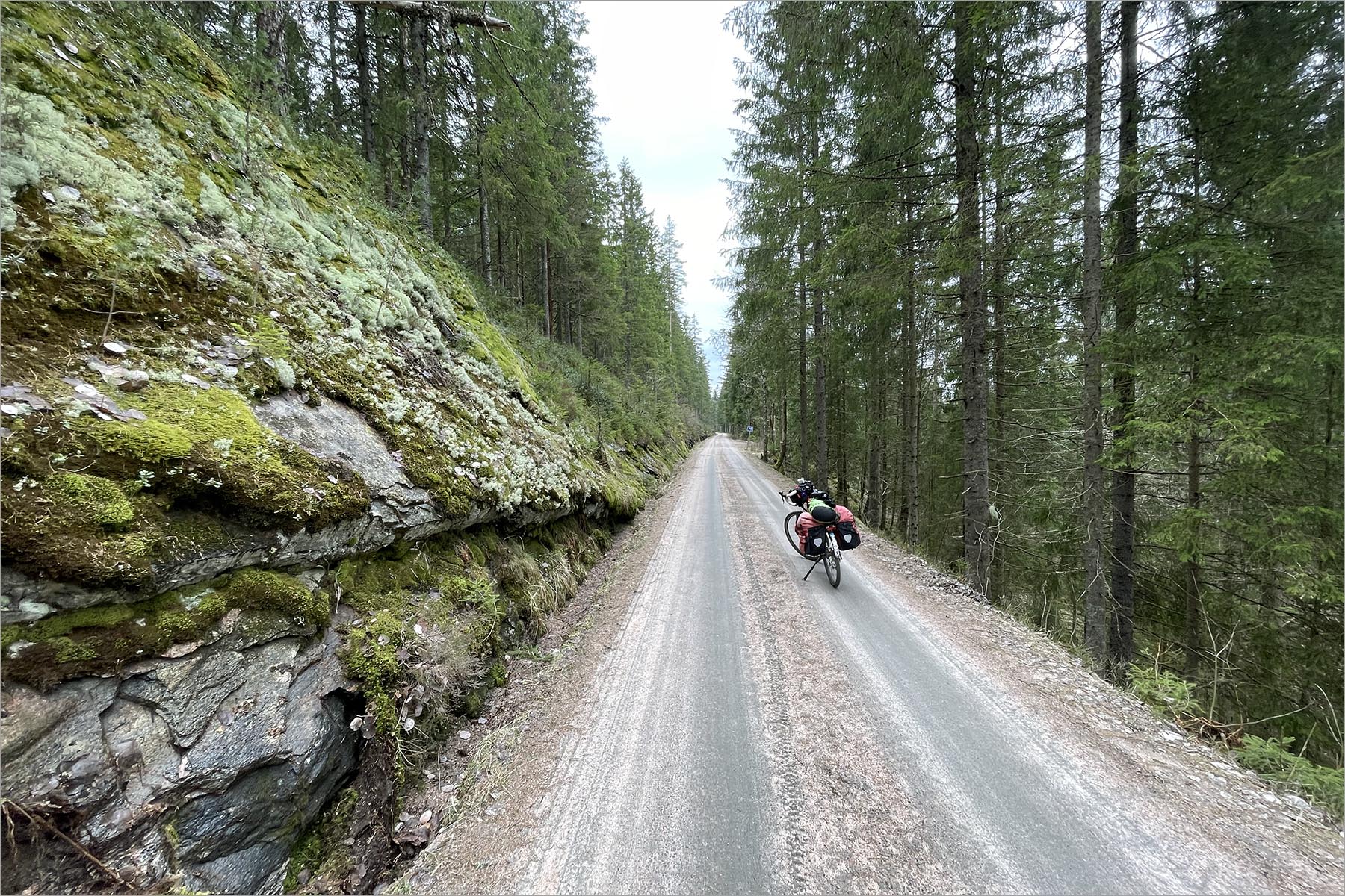 De kleine weg gaat omhoog van 160 naar 230 meter en loopt een stukje parallel aan doorgaande weg 27. Het asfalt wordt een golvende, onverharde bosweg met rotsen en verderop een diepte met vergezicht. Omgeving en route zijn prachtig, dit is het beslist het mooiste stuk Zweden tot nu toe. Nu en dan lukt het de zon bijna om door de wolken heen te breken, wolken waaruit geen regen valt. Vegen blauwe lucht worden zichtbaar, ik ben nog steeds op weg naar Borås.