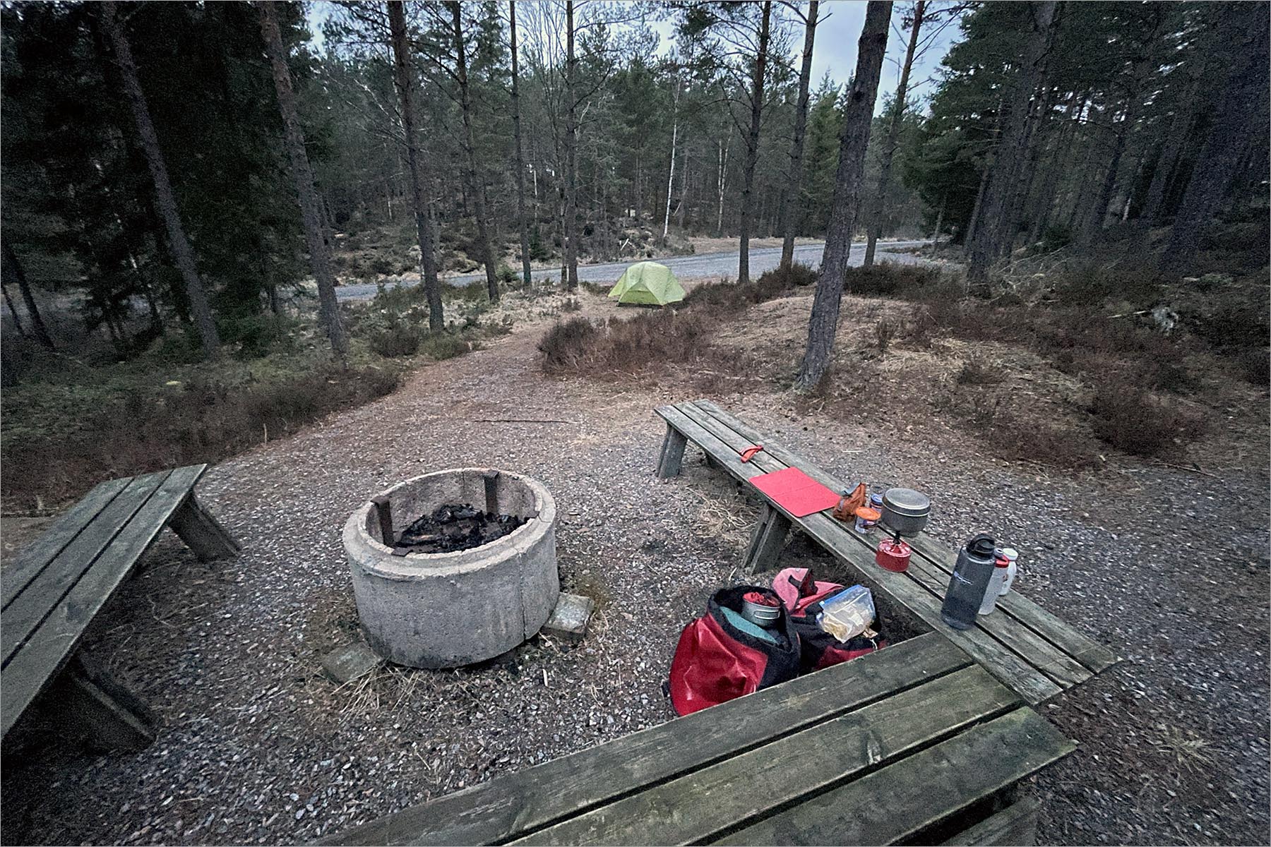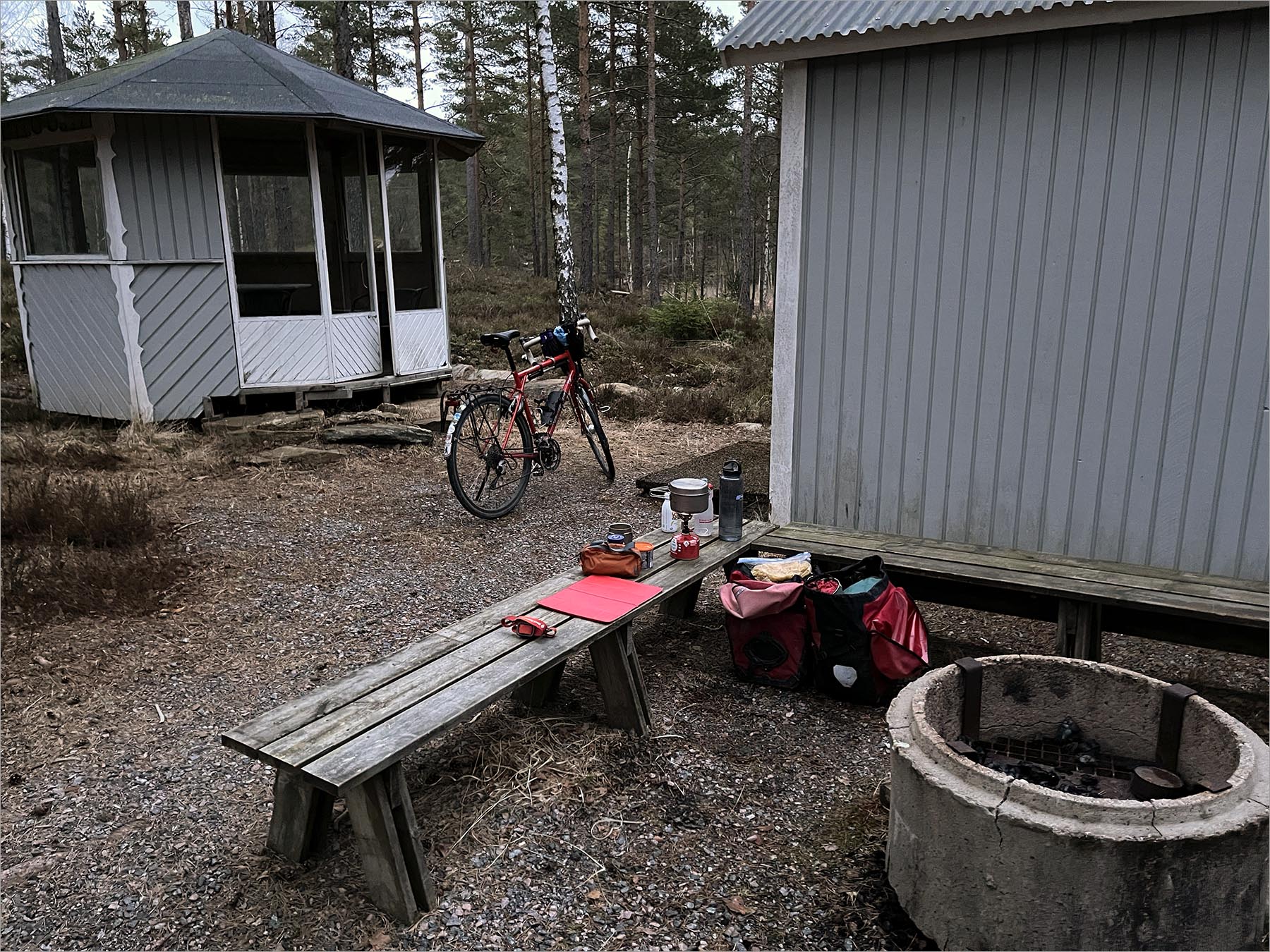 Bij de schietbaan is niets, bij een verkenning zie ik alleen braakliggende grond, geen plek. Ik kijk op de kaart en zie dat ik na een kilometer langs een meer kom, het Holmevattnet. Bij meren zijn soms banken en shelters. Fietsen! Bomen, zand en stilte. Ik bekijk de kaart nog eens goed en zie dat de oever waar ik een plek vermoedde een brug voor deze weg is. Er is daar niets. Ik kijk op van m’n telefoon en zie een klein rechthoekig huis, meer een soort flinke houten zeecontainer, met ervóór een kampvuurplaats met banken. Dat is ‘m. Het is tien voor acht.