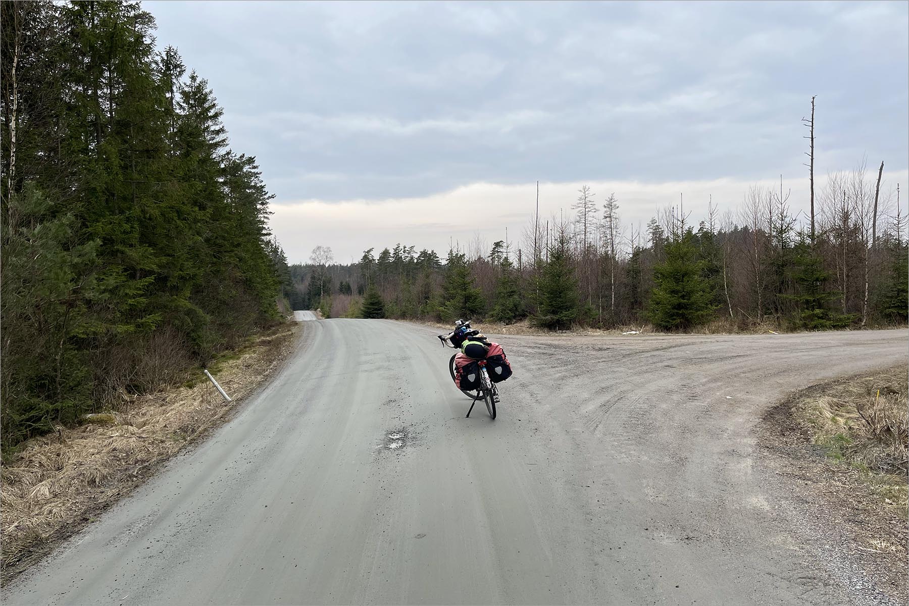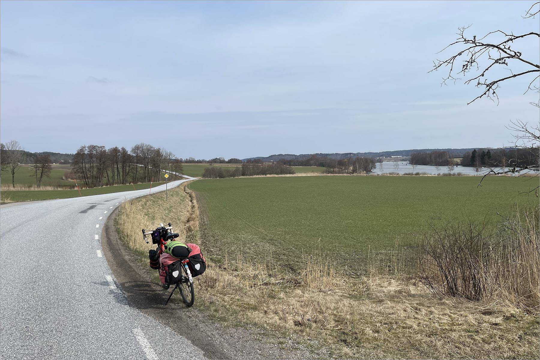 Het schakelen gaat niet soepel, ik stel de achterderailleur bij en fiets voldaan verder. Het is koud, maar het is leuk fietsen, met veel gegolf en opgeteld redelijk wat hoogtemeters. Na negen kilometer sla ik af naar het westen, verlaat ik het Götadal en gaat de weg omhoog.