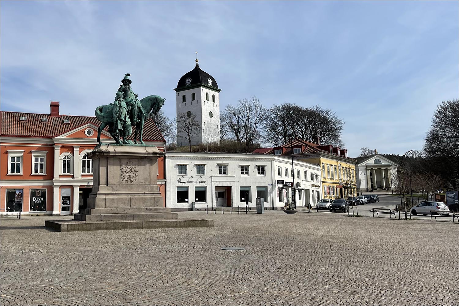 Kungstorget (Koningsplein), Uddevalla. De meneer op het paard is (koning) Karel X Gustaaf van Zweden.