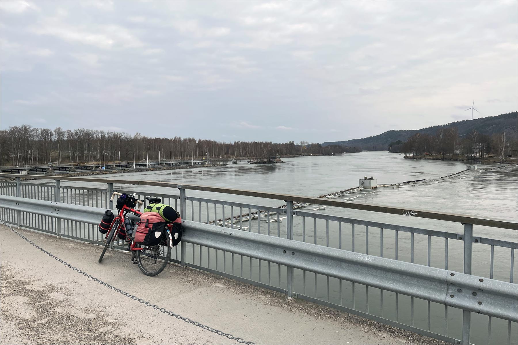 Met een fiets- en voetgangersbrug steek ik het brede water over en passeer de oudste sluis van Zweden, gebouwd in 1607. Overal ligt gravel, dat in de winter op de sneeuw wordt gestrooid om het wegdek stroef te maken. Zout werkt niet bij echt lage temperaturen.