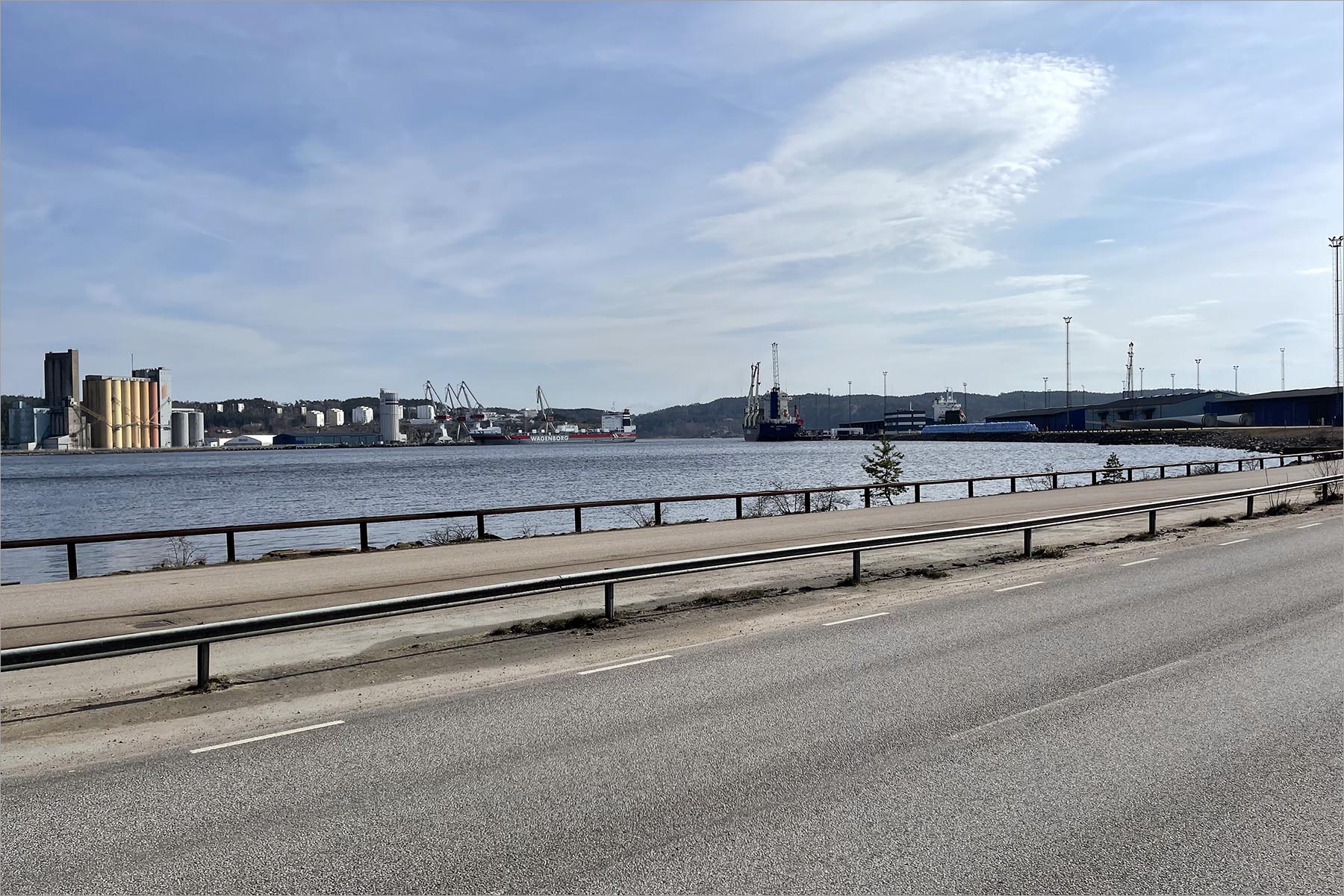 Links van me ligt open water met een haven. Ik zie grote schepen en kranen. Dat begrijp ik niet, Uddevalla ligt toch niet aan de kust? Toch wel, maar als je niet ver genoeg inzoomt op de kaart van de Zweedse westkust zou je kunnen denken dat Uddevalla een stuk landinwaarts ligt, in een merengebied. Die meren zijn fjorden, smalle en langgerekte stukken zee die het land in prikken. Noorwegen staat er, samen met regen en onbetaalbaar bier, om bekend, maar Zweden heeft ze ook, aan dezelfde westkust, alleen zuidelijker en met minder hoogteverschillen. Uddevalla ligt aan het Byfjord (‘Buufjord’), dat overgaat in het Havstenfjord (‘Hawsteenfjord’, Zeesteenfjord), dat uitmondt in het Skagerrak. Van zee (Skagerrak) naar Uddevalla is best een stukje varen, maar kennelijk loont het de moeite, de haven van Uddevalla kan ervan bestaan.