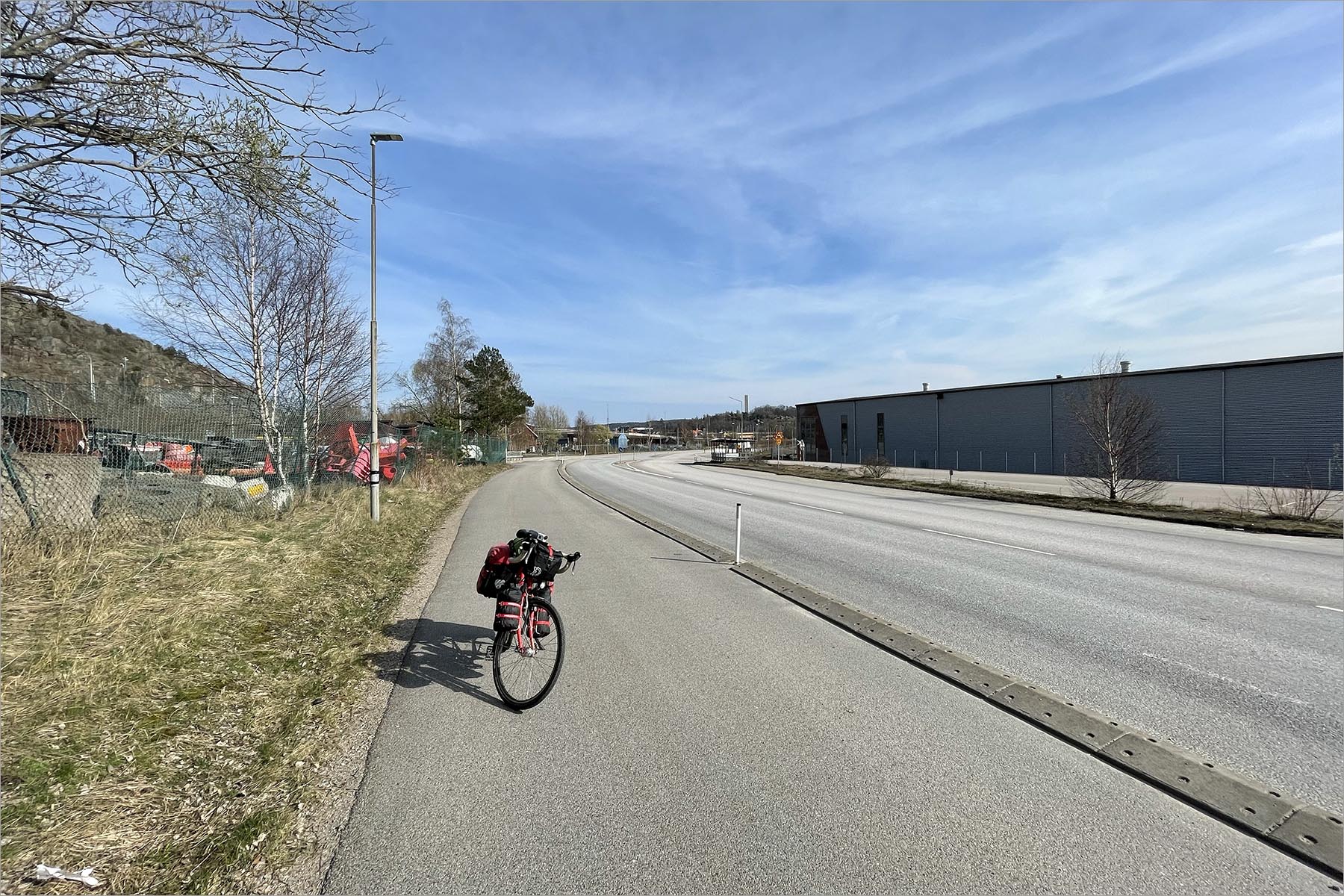 Het is, in gewoon Nederlands, een enorme teringzooi. Industriegebieden zijn zelden idyllisch en meestal een onherbergzame verzameling van beton, staal, afval en zwart uitgeslagen smeerolie. Met veel vage stukjes. Dit is minstens zo erg, al is m’n herinnering anders. Toen was er wel industrie, maar werd er niet gebouwd of aan de weg gewerkt. Het fietspad houdt ineens op bij een bouwhek langs omgewoelde grond en is met wat spoorzoeken te herleiden langs stukken opgebroken weg. Roest, overwoekerd staal en meer zwerfafval dan in de afgelopen dertien dagen bij elkaar. Het is, simpelweg, heel verschrikkelijk en iets dat ik in Zweden niet voor mogelijk hield. Ik fiets langs grote fantasieloze industriegebouwen, autoshowrooms, nog meer autoshowrooms, autowerkplaatsen, nog meer autowerkplaatsen. Het is – ik ben de routemaker – een zelfgekozen lot om hier te fietsen, maar dit is de enige weg tussen Uddevalla en Munkedal.