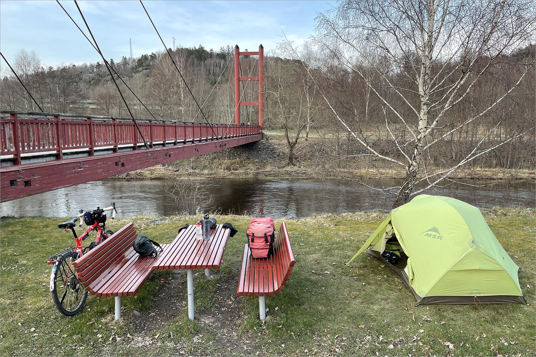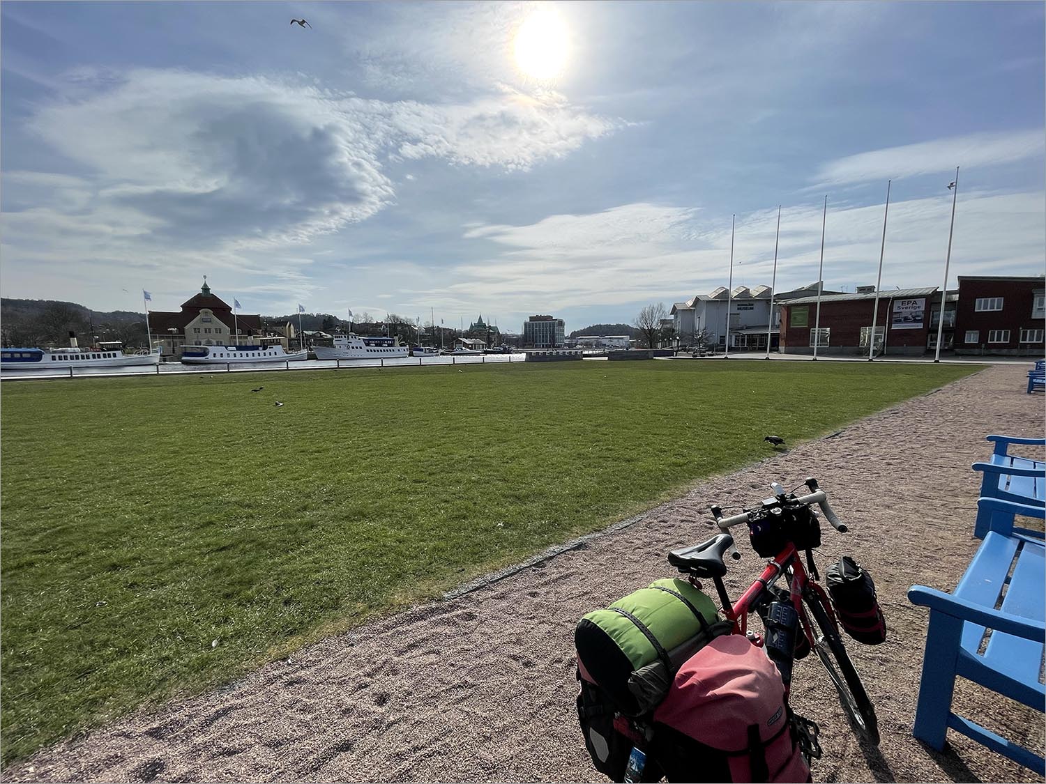 In het park zijn de lichten aangegaan, boven me begint het te bewolken. Geen zorgen, morgenochtend bewolkt, morgenmiddag zon en geen regen. M’n fiets zit aan de picknickbank vast, in de tent achter me ligt de slaapzak klaar. Hier zijn is opnieuw een klein avontuur, morgen ga ik op weg naar de grotere versie. Nog even geduld. Eerst slapen, in het Örekilspark in Munkedal.
