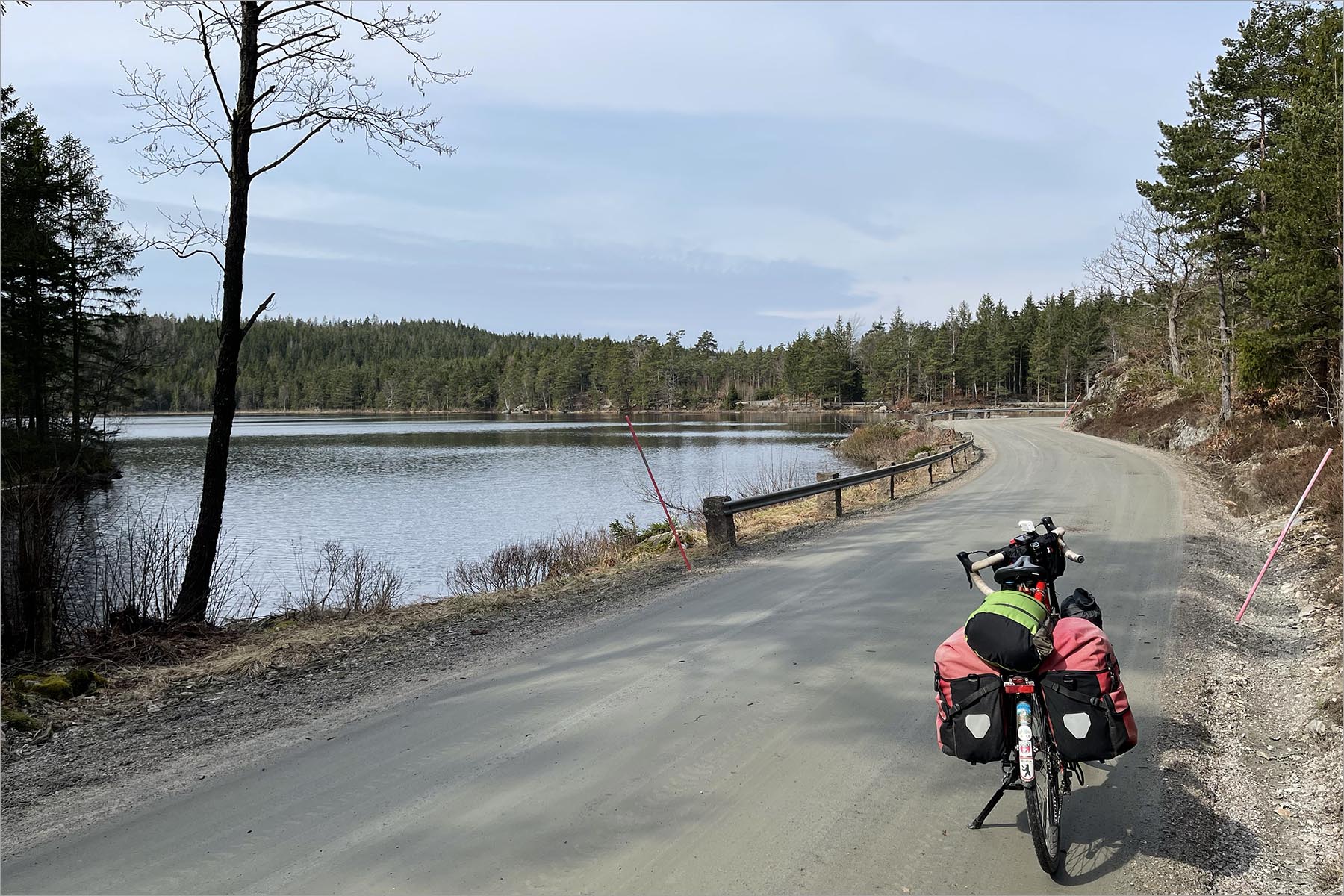 De klim stopt bij 101 meter, hoog wordt het hier nooit. Ondertussen is de lucht blauw verkleurd achter een dunne witte sluier. De waterige zon schijnt er af en toe doorheen, op een Stavangerfietser die zich domweg gelukkig voelt. Volgens Yr zit er een weeromslag aan te komen, de komende dagen gaat de temperatuur richting de 13-14 graden. Dat lijkt nu al te beginnen, tussen de bomen en in het dappere zonlicht gaan eerst m’n jas en handschoenen uit, daarna de dikke trui. De zandweg, de O668, is in één woord geweldig en kronkelt kilometers lang door stil dierenbos. Langs het ene meer na het andere, met af en toe een huis tussen de bomen en een enkele auto. Een kralensnoer van kleine landschappen, een feest om te fietsen.