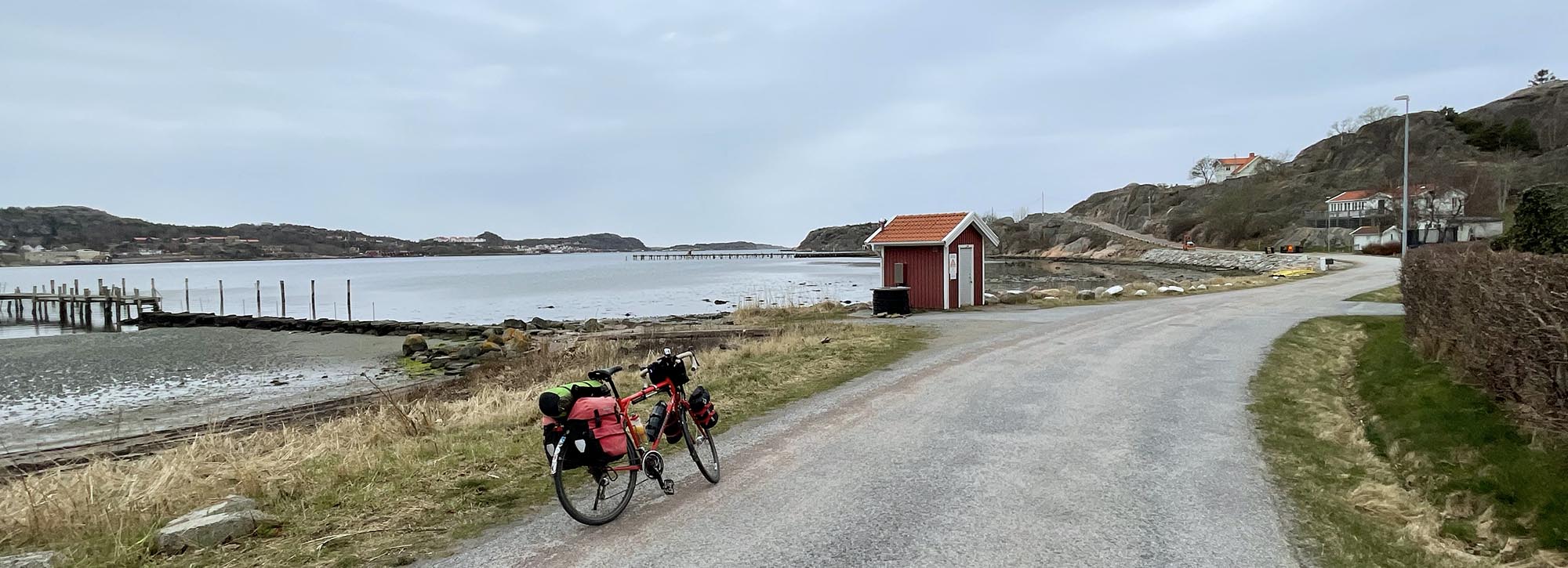 De dunne stroom huizen druppelt na en stopt. Ik fiets langs gladde rotsen, inhammen en drooggevallen modder, onder een dak van lichtgrijze wolken. Over de Kustvägen, die de grens volgt van brak fjordwater en rotsig kustland. Vlak, langs kleine rode schuren, en klimmend, naar hoogtes met uitzicht over de wonderlijke mix van steen en water. Voorbij Sponslätt och (en) Saltebro gaat de weg het land in, golvend naar het noorden.