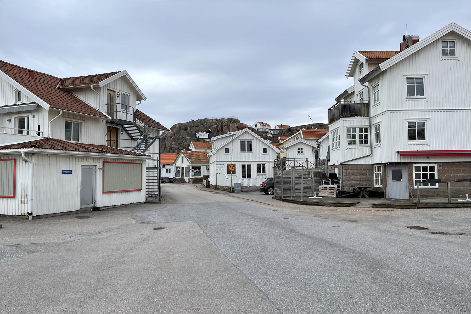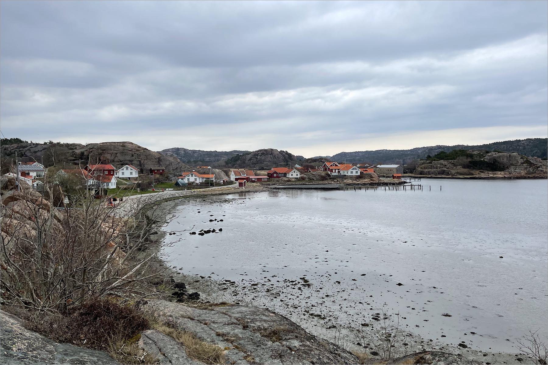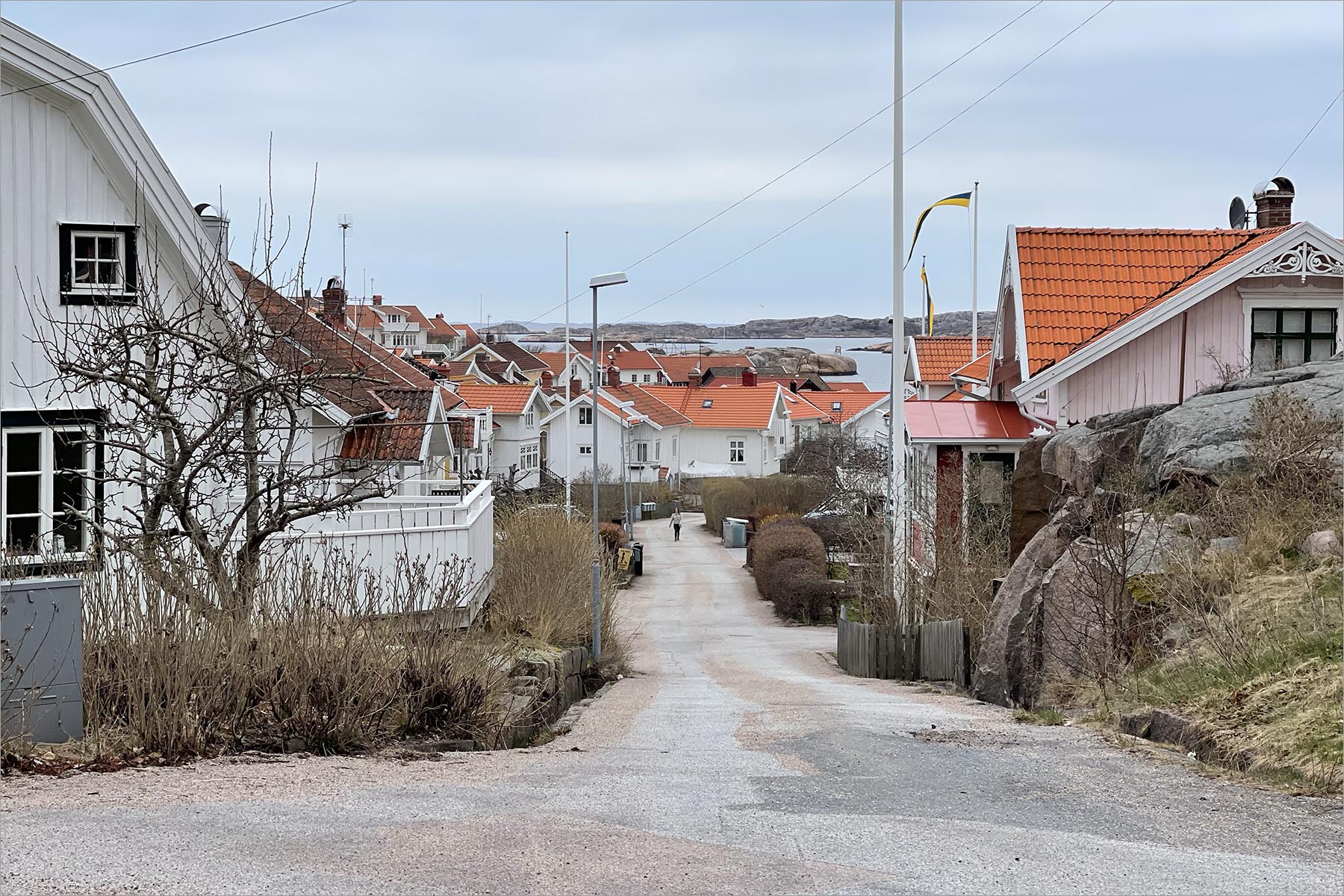 Bij Bovallstrand bereik ik de westkust, bijzonder omdat het een scherenkust is, fjorden die omringd zijn met bolle steenformaties en rondgestrooide rotseilandjes. Als een stenen landschap dat onder water is gezet, waardoor alleen de toppen van de rotsen er bovenuit steken. Glad gepolijst door eeuwen gletscher-ijs, zonder begroeiing en strandloos uit het water oprijzend. Geen emmertjes-en-schepjes kust, wel een hengel-en-schepnetjes kust waar Dirk en Sietse voor het eerst krabben, garnalen en kleine zeesterren zagen. Een plek die in de top tien staat van best bezochte plekken in Zweden. Tussen de witte huizen met oranje daken staan geen bomen, op elke vlakke vierkante meter tussen de keien woont iemand. Een dorp als op een kalenderfoto, waar ik de enige niet-Zweed ben. En de enige bezoeker.