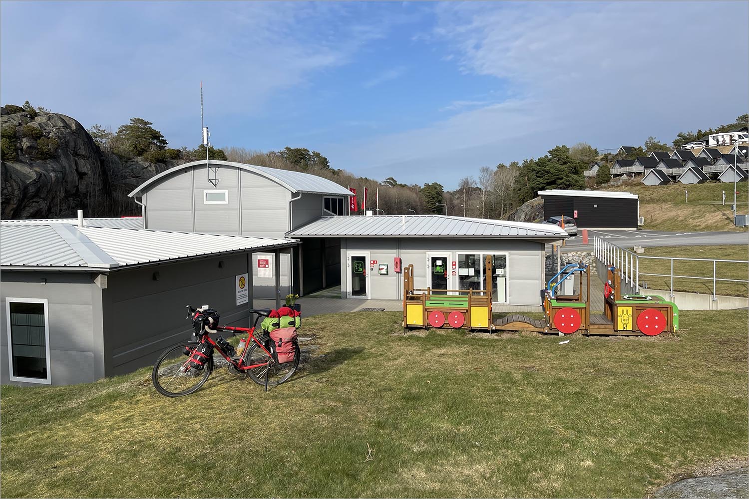 Op een kleine hoogte naast het servicegebouw zet ik m’n tent neer. In het gebouw zit een grote kök met kookplaten, tafels en stoelen en stopcontacten. Daarnaast het sanitairgebouw. Met een keycard kom ik overal in, een kaart zonder saldo, alles is inbegrepen. Dit is de beste rustdagcamping ooit.