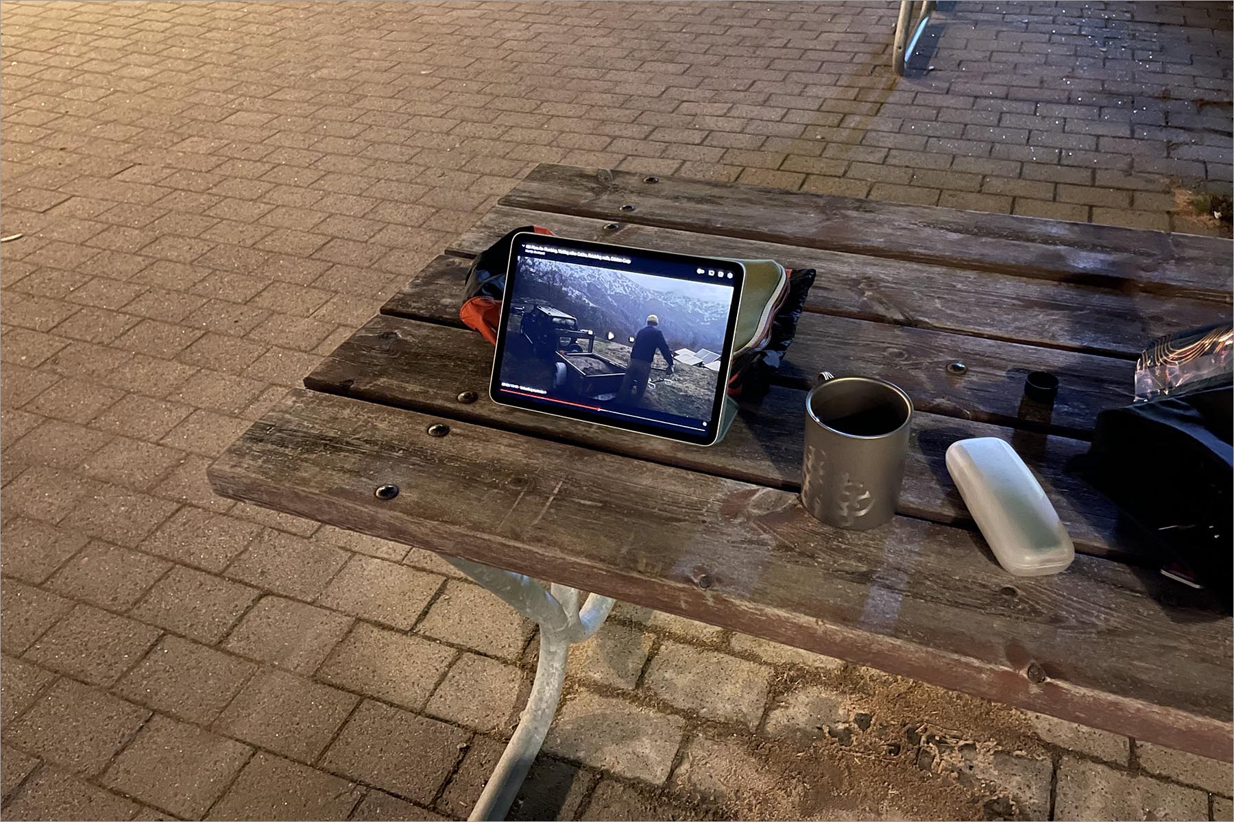 Ik zou naar bed kunnen gaan. Geen denken aan, het avondprogramma begint. Ik trek m’n donsjas aan en ga buiten aan de picknicktafel zitten. Daar is de wifi goed. Binnen zitten had gekund, maar na 15 dagen buiten leven, alleen onderbroken door de avond en nacht in de jeugdherberg van Mölln, wil ik buiten zijn. Hier zie ik de schemer veranderen in donker, hoor ik de geluiden van de avond en zie ik in de verte de lichtjes van Strömstad. Behaaglijk warm in m’n donsvriend installeer ik me met m’n iPad en de halve zak wijn die ik nog heb. Elke zondagmiddag is er een nieuwe video van Martijn Doolaard, de Nederlander die ik op YouTube leerde kennen van z’n fietsreis door Noord- en Zuid-Amerika en die nu in de Italiaanse Alpen eigenhandig twee leistenen hutten ombouwt tot z’n thuis. Ik volg ‘m vanaf dag 1. De video van vandaag is natuurlijk nieuw, en ook die van vorige week zondag en van twee weken geleden. Genoeg te kijken.