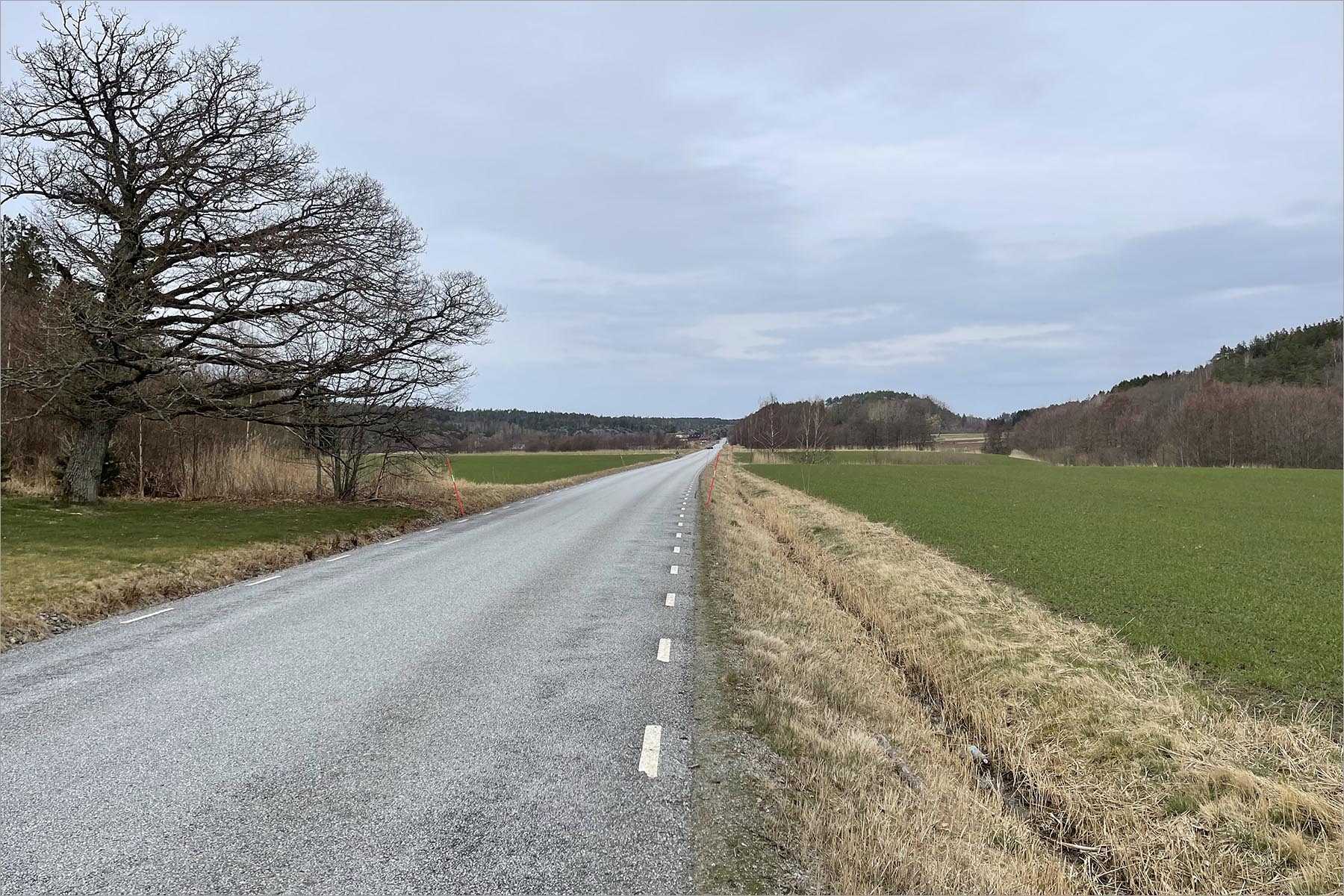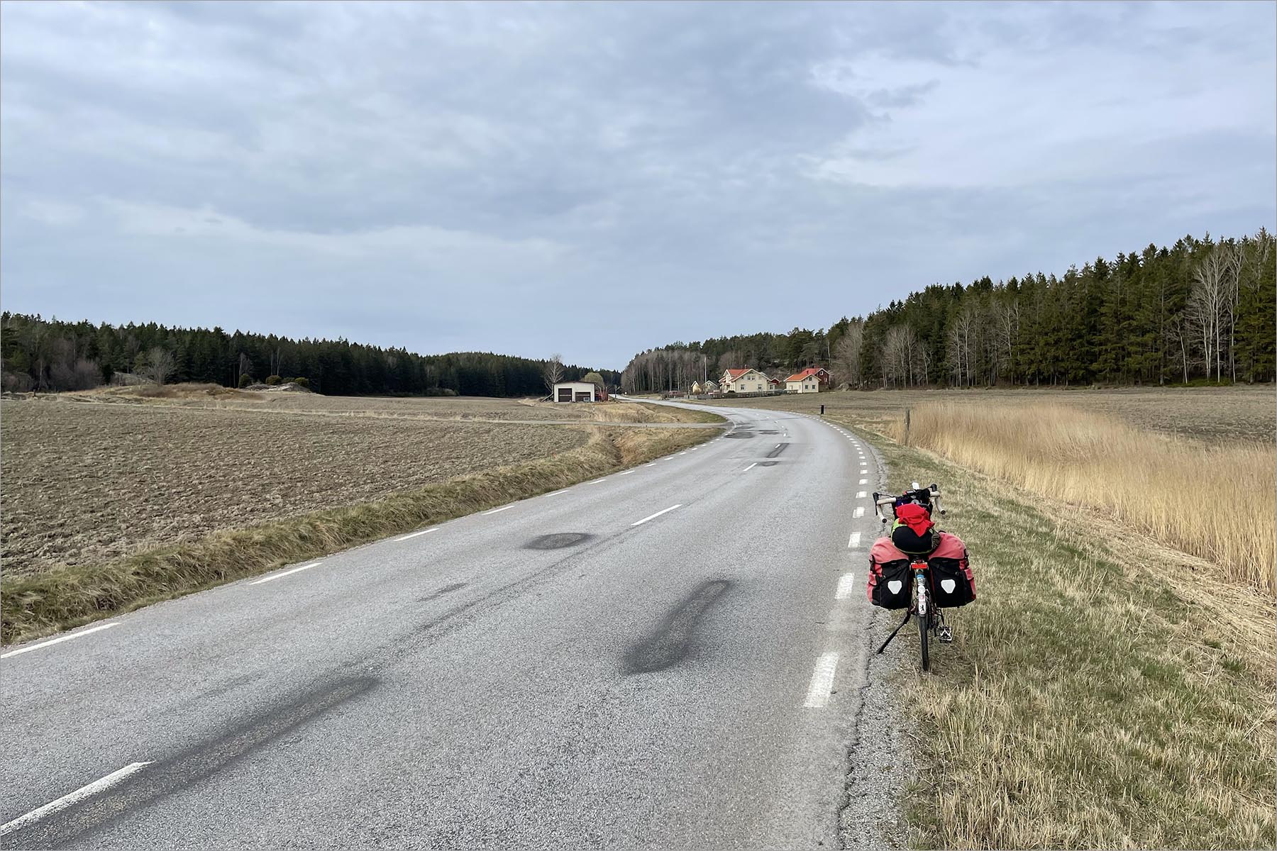 De weg en ik verlaten de kust en gaan het land in. ‘Ik ben aan de beurt’ denk ik, ‘hier golft elke jävla meter’. Ik krijg ongelijk, zelden was een verkeerde inschatting zo fijn. Een enkele golving is er, maar ook hele stukken vlak en de kleine weg is, al is de zondagmiddag een eind onderweg, helemaal leeg. Na de vele stops kan ik hier kilometers maken, als een dolle.