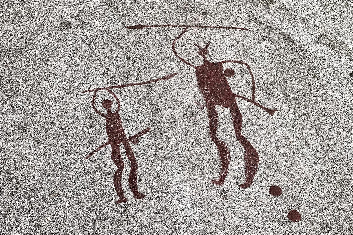 Bijna in Tanumshede zie ik in de bosrand op een afstandje van de weg iets gebeuren. Mensen die rondlopen alsof ze iets bestuderen, een bord naast de weg met ‘UNESCO world heritage‘. Ik ga kijken, UNESCO-werelderfgoed in een onbetekenende bosrand bij een dorp met 2000 inwoners, dat wil ik zien. Ik zet m’n fiets neer en loop naar waar het gebeurt. Dichterbij komend zie ik een rotsplaat met rode tekeningen. In mij wordt van alles wakker. In m’n middelbare schooltijd wilde ik archeoloog worden. De bibliotheek in Uden was niet heel groot, maar ik had niettemin elk (verhalenvertellers overdrijven graag) boek over veenlijken, viking-graven en Schliemann’s Troje gelezen. De bordeauxrode, voor de zichtbaarheid ingekleurde (oorspronkelijk hadden ze geen kleur) tekeningen zijn zoals ik me rotstekeningen voorstel en me herinner uit die boeken.