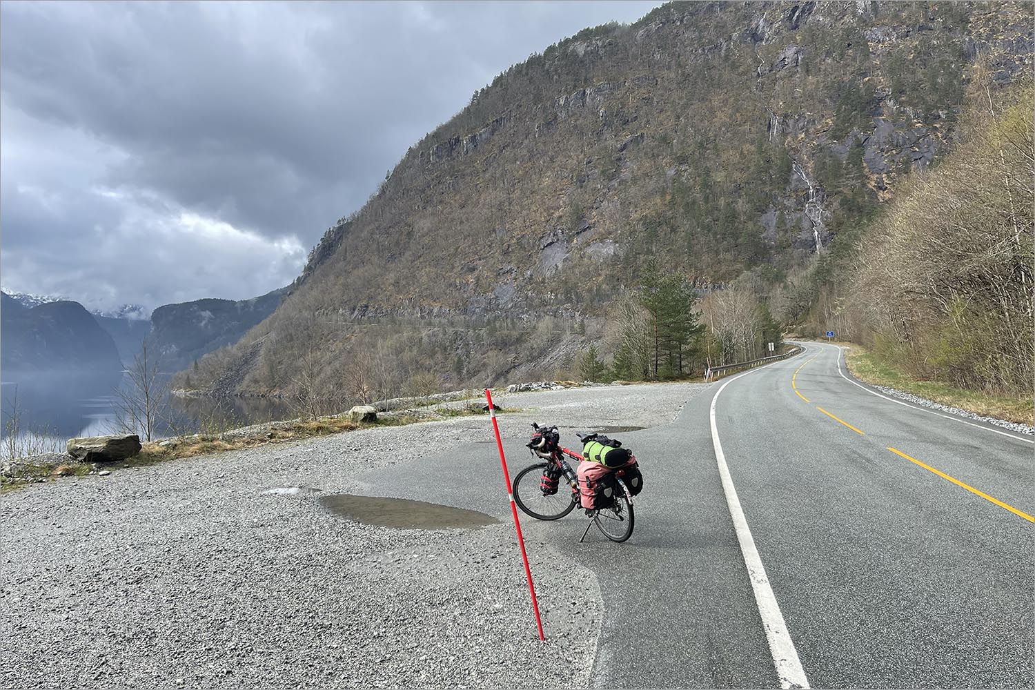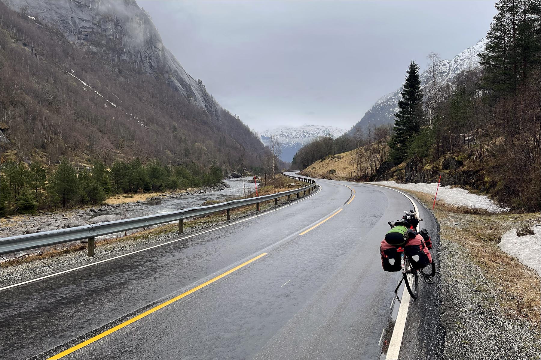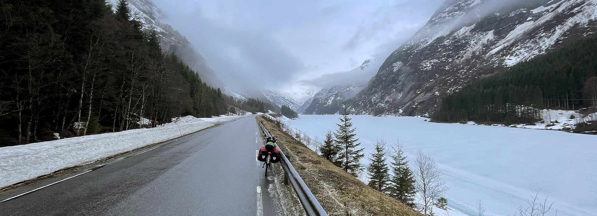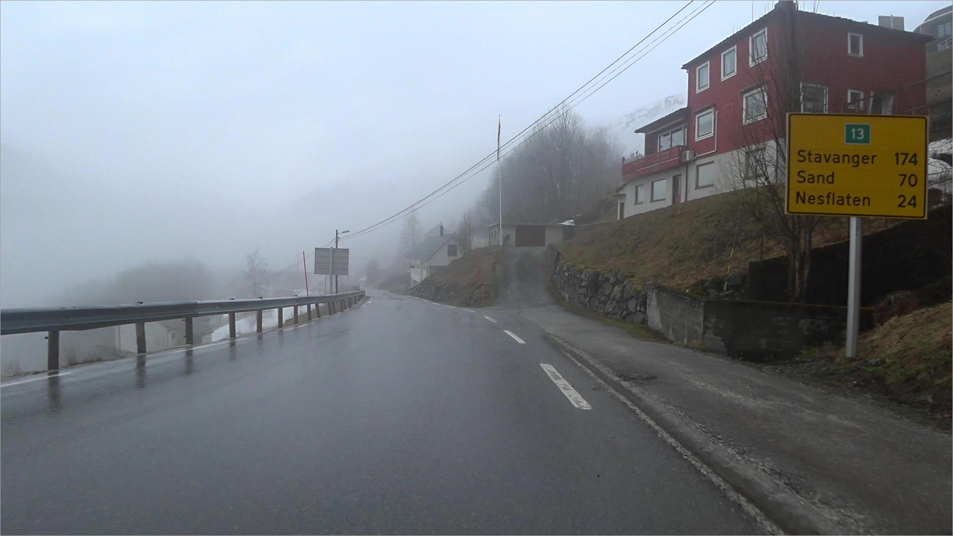 Na drie kilometer verlaat ik de E134 en sla ik linksaf, riksvei 13 in, op Noorse websites gepromoot als scenic route Ryfylke, genoemd naar het district waar hij doorheen gaat. Kijkend naar de weg die in de verte in de mist verdwijnt moet ik erkennen dat het inderdaad behoorlijk scenic is – al zie ik er geen moer van. Maar man, wat is het gaaf om hier te fietsen.