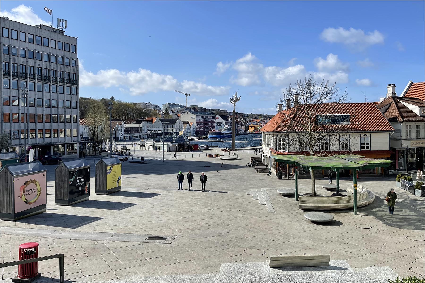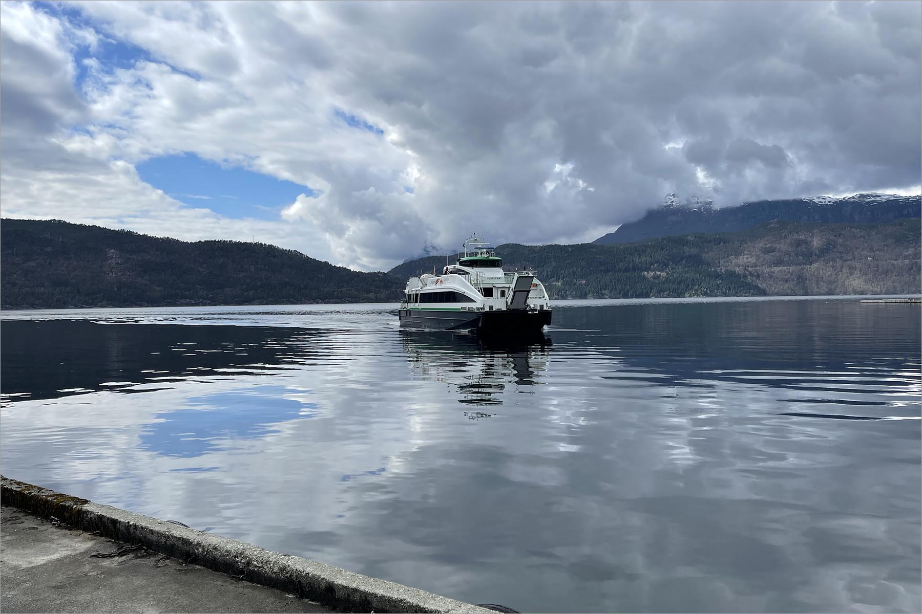 Als uur ‘U’ nadert, zie ik iets wits door het fjord varen. Wit en snel. Het wordt groter en krijgt vorm. De ferry die Sand met Stavanger verbindt (een tocht van een uur en vijftig minuten) is een snelboot, zoiets als een watertaxi op de Nieuwe Maas. Geen auto’s, alleen voetgangers. En een enkele fiets. Terwijl de boot de kade nadert daalt de loopplank in het midden van de boeg, nét voor de kade geeft de schipper tegengas, de loopplank gaat neer en de wachtende mensen lopen de ferry op. Alles in één vloeiende beweging, zonder een seconde te verliezen. Ik loop er met m’n fiets achteraan, de loopplank op. Een vrouw in een donkerblauw uniform en een metalen teller in haar hand kijkt me aan. “Stavanger?” Ik knik, met een blik waarin zowel verwachting als afscheid ligt. “Stavanger”.