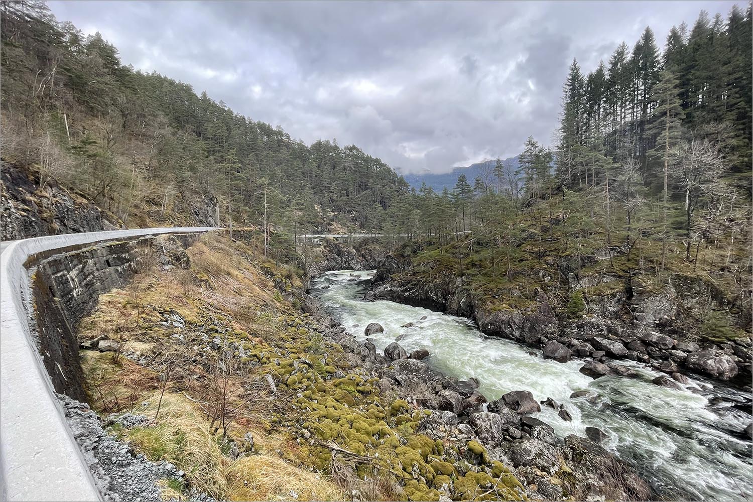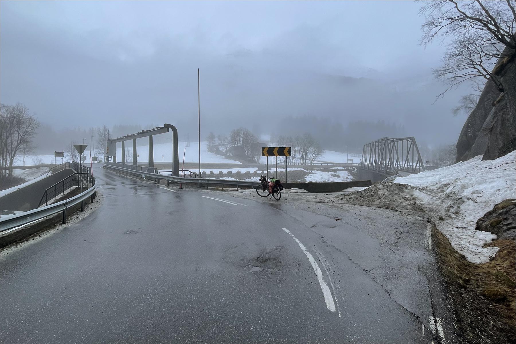Waar het Røldalsvatn versmalt tot rivierbreedte herken ik twee bruggen van mijn verkenning op Google Street View, thuis. Wonderlijk om ze in het echt te zien, ik neem de autobrug, de toerit naar de fietsbrug ligt vol sneeuw. Niet dat er veel auto’s zijn. Er zijn helemaal geen auto’s.