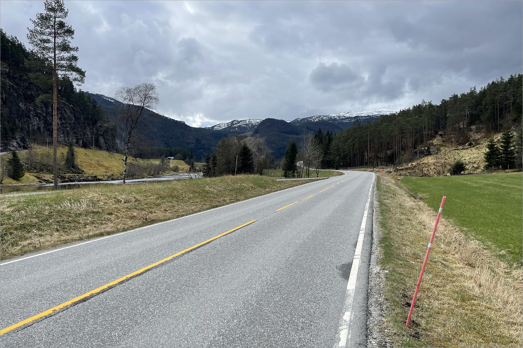 In Nesflaten zit ik op 90 meter, fietsend langs – opnieuw – het Suldalsvatn weet ik niet wat me overkomt. Naast de weg staan berken in het blad. In het blad. Dat is voor het eerst in weken, waarschijnlijk voor het eerst sinds november, toen ik in Nederland de laatste ervan zag vallen. Hier is het werkelijk voorjaar, al stroomt en valt overal ijskoud water langs en van de rotsen. Vrouwe Hovden zei dat als het daar nog volop winter leek, in Suldal (de grote gemeente waar ik sinds het Brattlandsdal doorheen fiets) de lente al begonnen was. Dat is echt zo. Het hoogteverschil van 900 meter betekent in deze overgangsmaand ook een seizoensverschil.