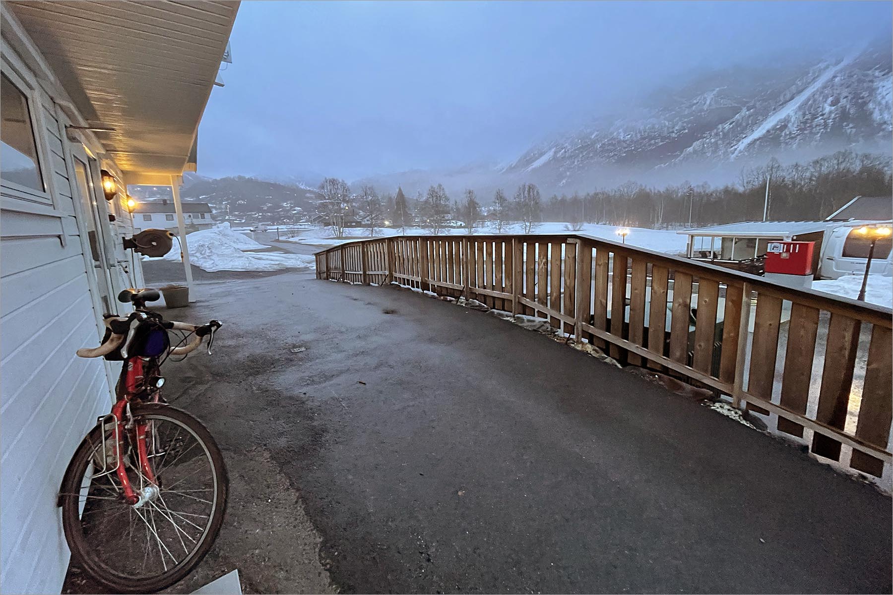 Ik ontbijt met het laatste Adventure Food ontbijt, dat zo lekker is dat ik het voor deze morgen heb bewaard. Røldal en de bergen eromheen zijn gehuld in een wolk van regenmist, waarin het landschap met zachte houtskool is getekend. De wolk wordt dunner en drijft tegen de bergwand omhoog, een bergwand met sneeuw in plooien en op velden.