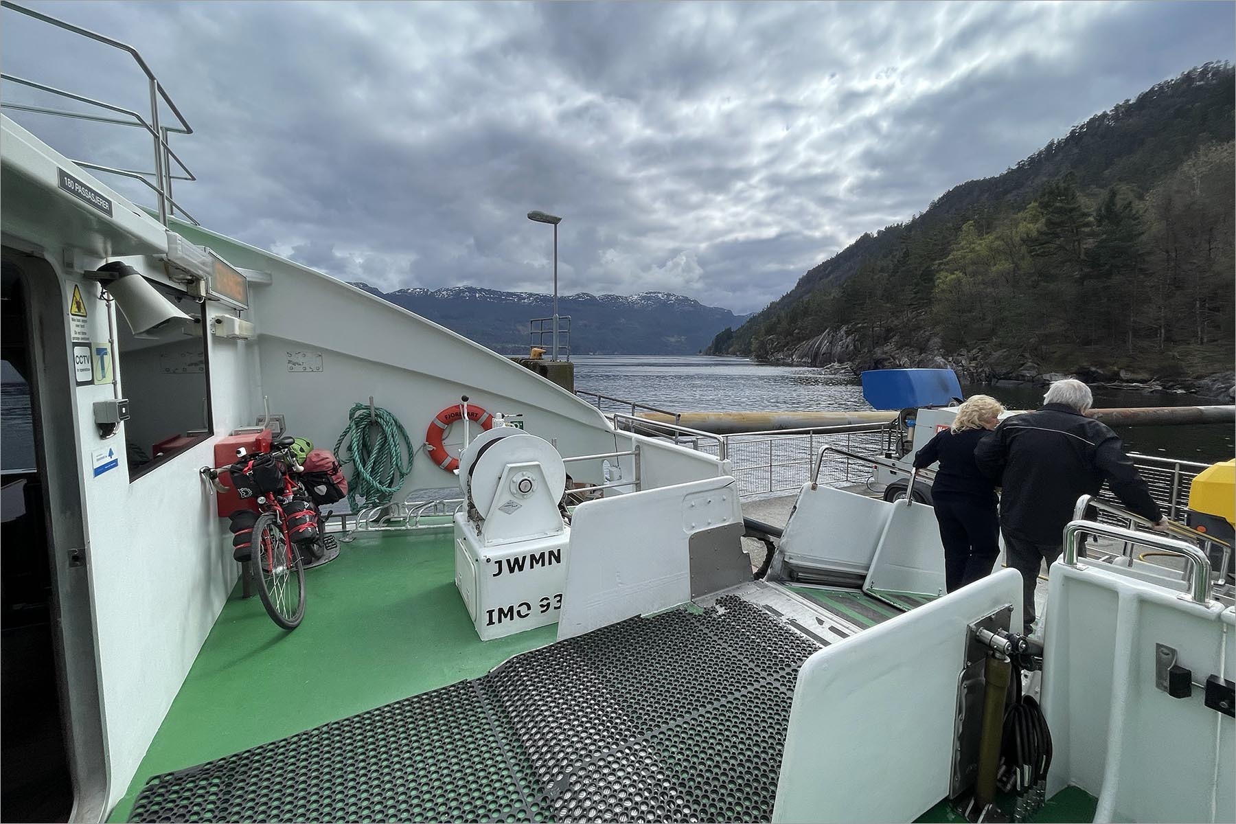 Met m’n telefoon koop ik op de website van Kolumbus een ticket, dat ik meteen in m’n mailbox krijg en als pdf kan downloaden. Bij online boeken krijg ik een korting van 25 procent, ik betaal NOK 230 (€ 19,80), fiets is gratis. De Noren begrijpen reizigers. Ik ben heel benieuwd hoe groot de ferry is en hoe gemakkelijk, of juist niet, ik m’n fiets erop rijd. Waar de boot straks aanlegt is niet meer dan een betonnen kade, zonder de stellages en beweegbare rijbanen die ik ken van de ferry’s tussen Duitsland, Denemarken en Zweden. Niets wijst erop dat hier iets aan kan leggen dat groter is dan een roeiboot.