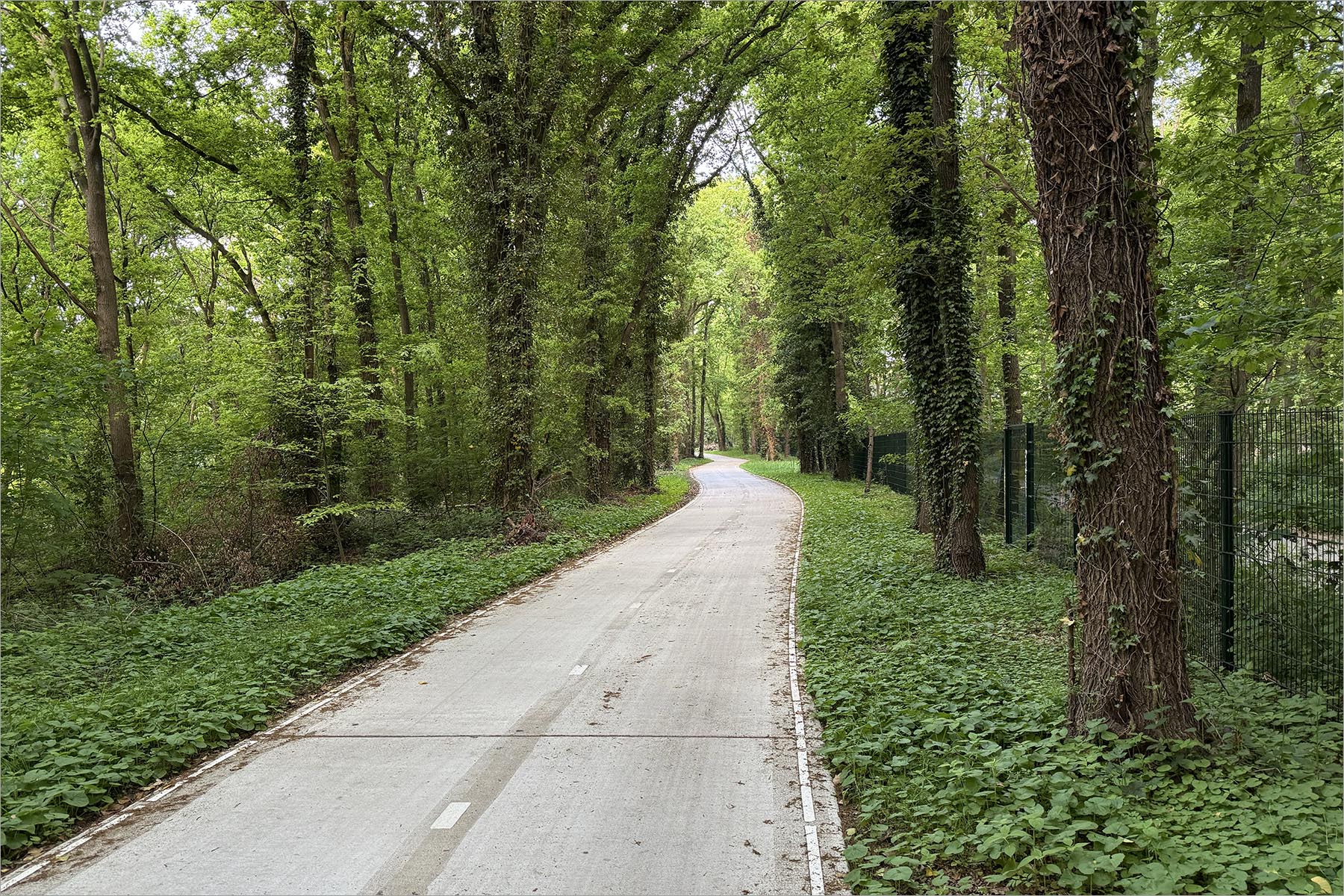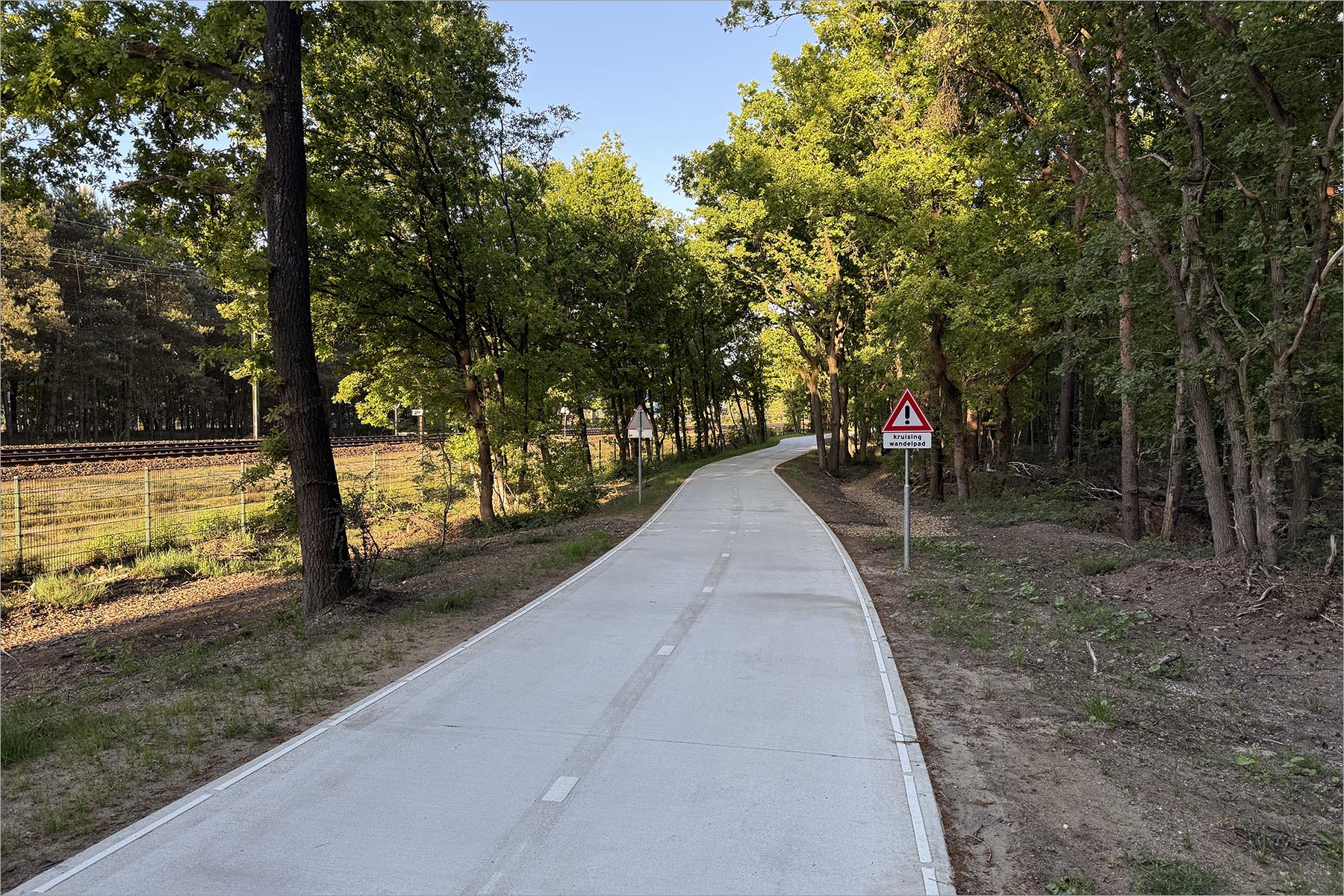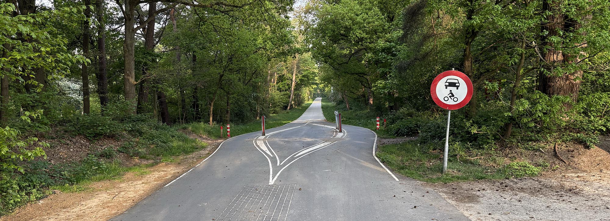 Foto hierboven: voorbij de afsluitboom (nu even open) wordt de doorfietsroute weer een echt fietspad.