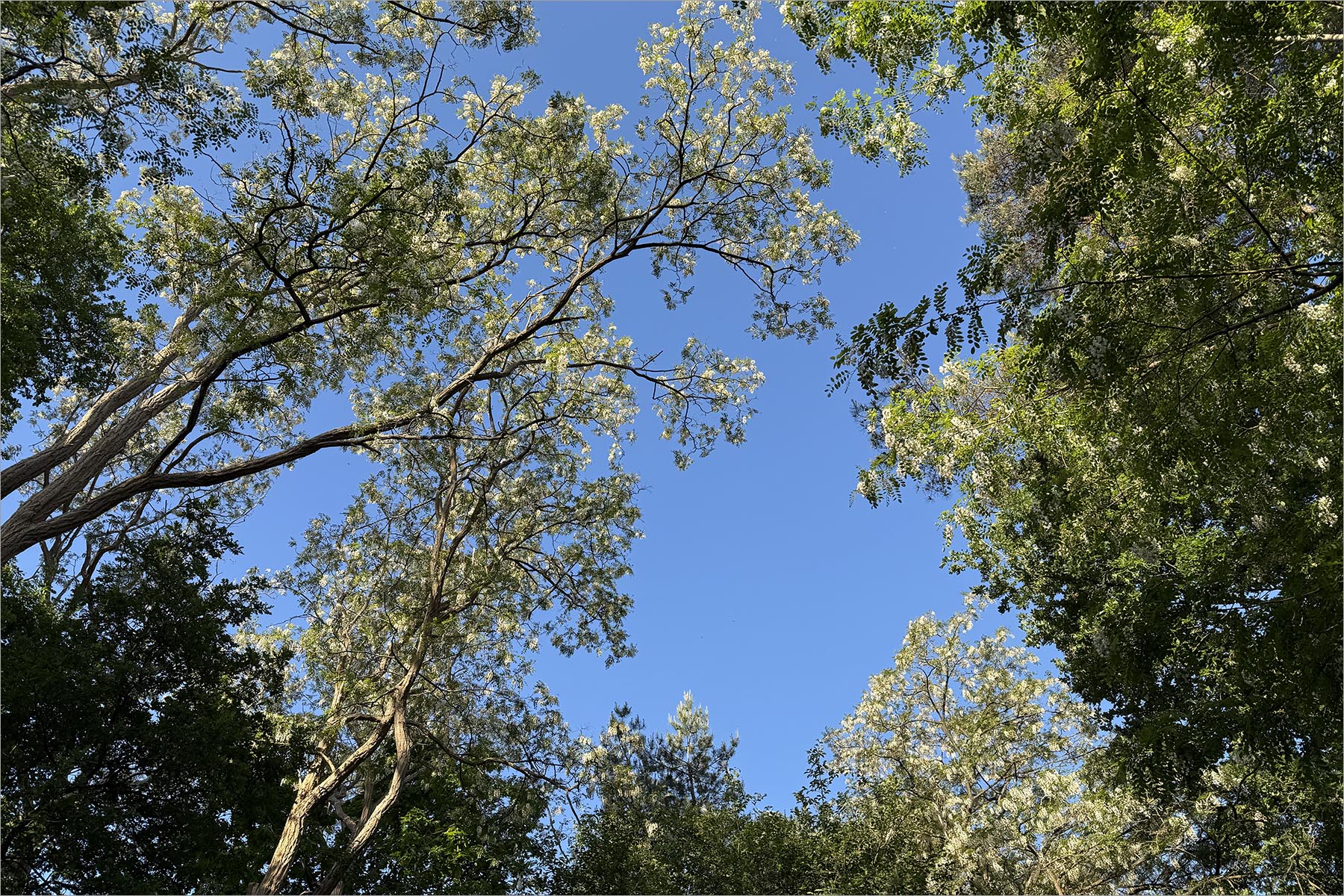 De wolken laten een gat vallen, de zon is terug en schijnt op de acaciabloesem boven het fietspad. Het is zo mooi dat ik het wil vangen in een foto, ik gebaar Elsbeth dat ik stop en haar zo weer zie. Het licht, de bloesem, de temperatuur, de mooiste weken van het jaar. Terwijl ik dat denk realiseer ik me hoe kwetsbaar dat geluk is en hoe vergankelijk momenten als deze. Als droog zand dat je van het strand opraapt en vast wilt houden, maar dat tussen je vingers doorglipt totdat je hand leeg is. Het voorjaar staat niet alleen in het teken van het nieuwe licht en het nieuwe groen, maar ook van de vergankelijkheid. Krokussen die in de ene week fier boven de bruine aarde staan, zijn een tijdje later niet meer dan sprieten, weer iets later zijn ook die verdwenen. De uitbundige tulpenbloemen van de magnolia doen het tien dagen, dan zijn ze weer verdwenen. Kersenbloesem, acaciabloesem, het is er maar even.